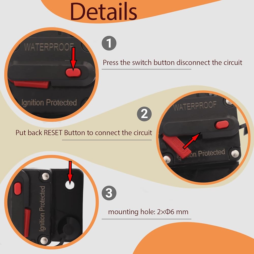 من السهل تشغيل: دائرة الكسارة 80 أمبير DC 12V-48V المستخدمة بدلاً من حامل الصمامات المضمّن ؛ يمكن تركيب قاطع الدائرة على لوحة أو جدار حماية ؛ وهي قادرة على الاستخدام للسيارات والبحرية ، مناسبة للسيارات ، السيارات ، RV ، محرك التصيد ، القارب ، يخت ، إلخ.