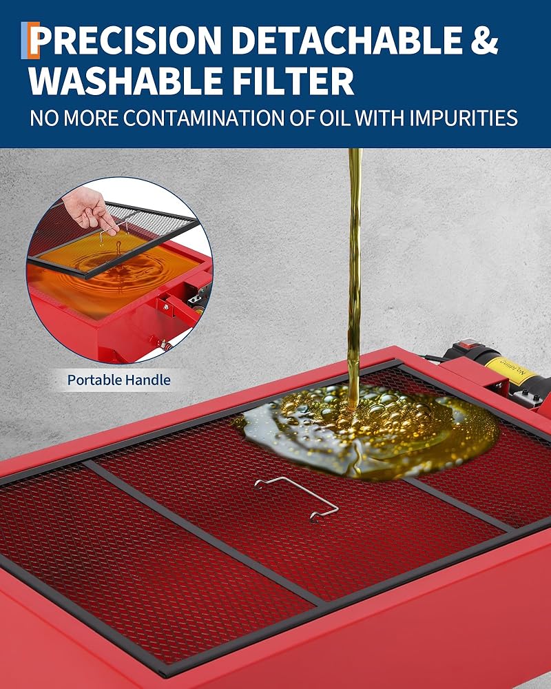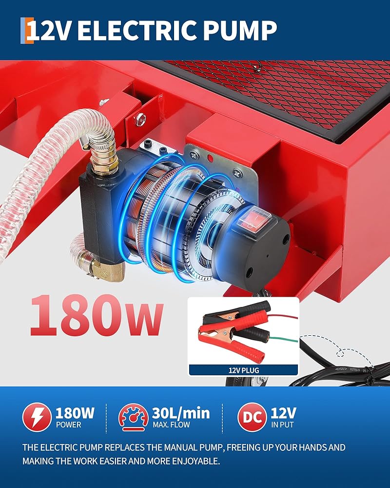 DUAL-PUMP SYSTEM FOR QUICK DRAINAGE: Featuring both electric and manual pump options at the front, the pan ensures fast and effortless fluid removal. The attached drain hose streamlines the process, cutting down time and labor during oil changes