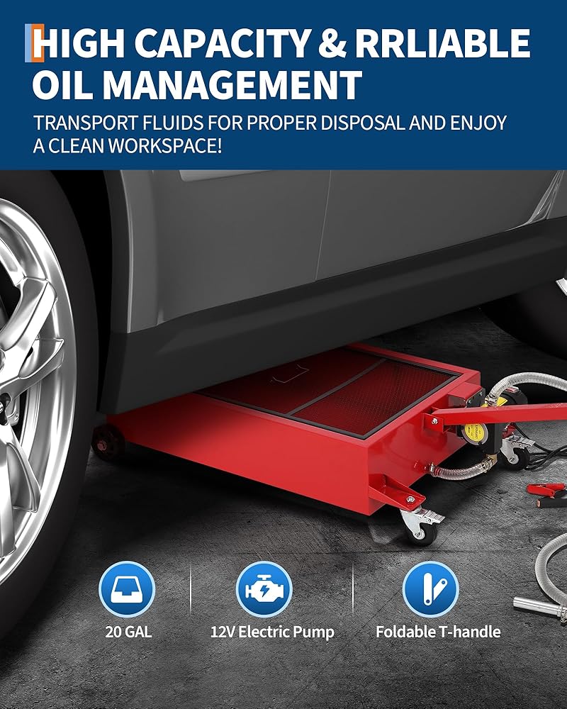 20-GALLON CAPACITY: Designed with a spacious 20-gallon capacity, this oil drain pan is perfect for handling large oil volumes from vehicles like cars, trucks, and SUVs. Its low-profile build enables easy under-vehicle access, simplifying oil changes without requiring a lift