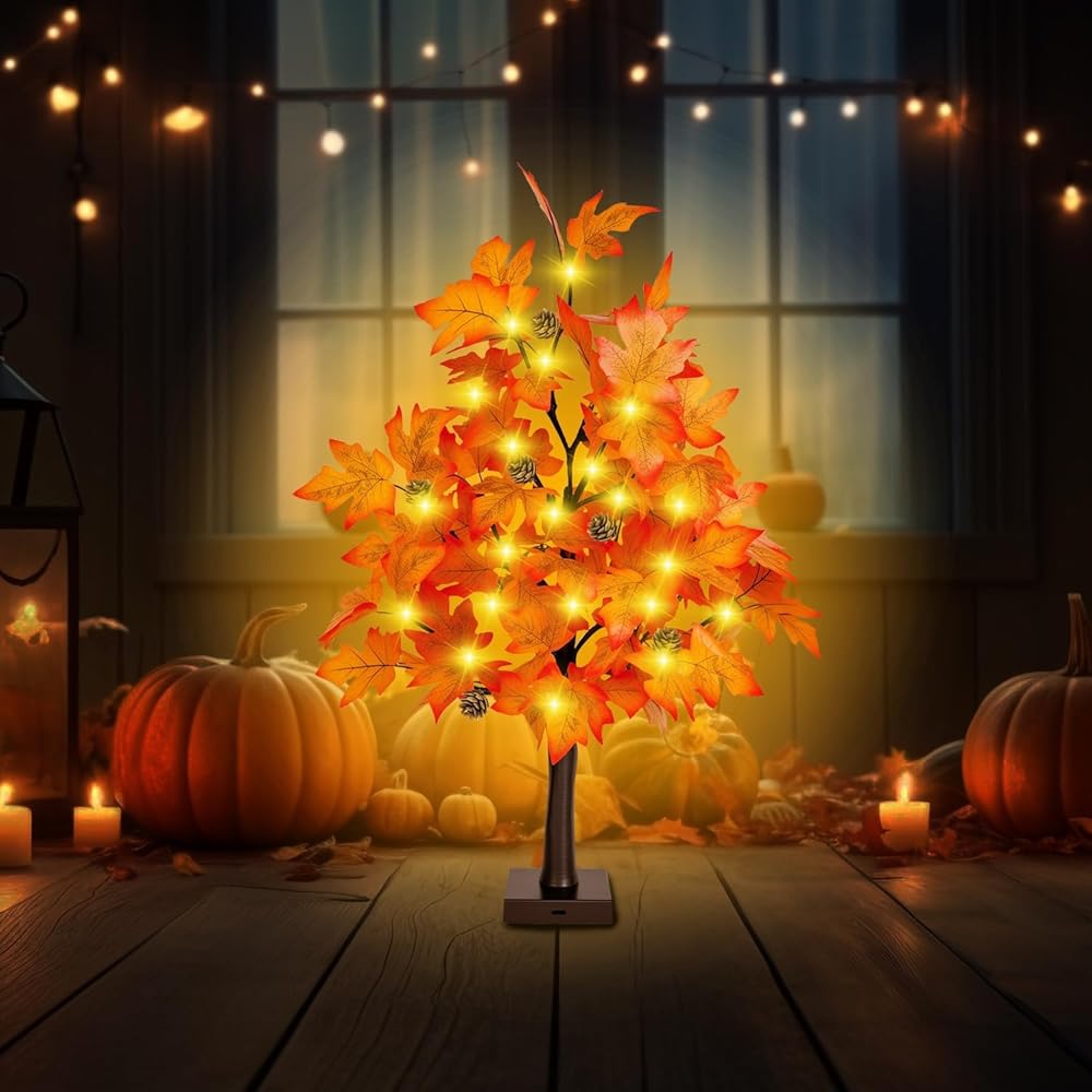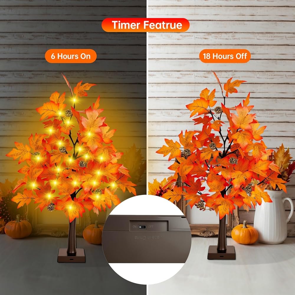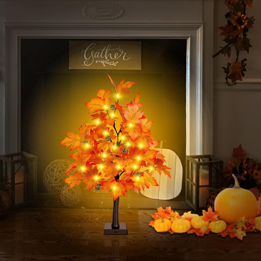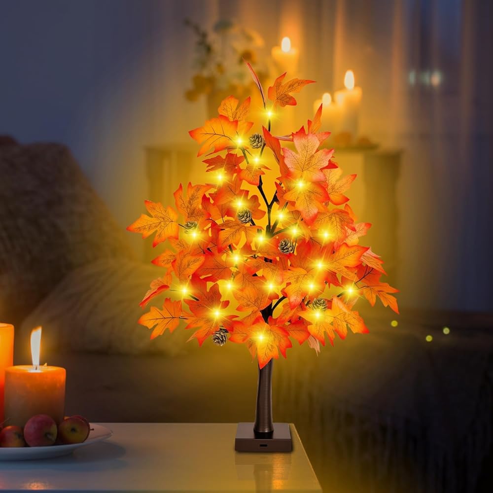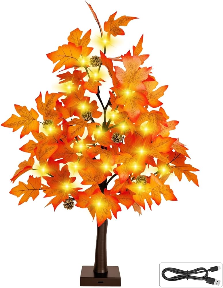 ديكور السقوط 2 قدم المضاءة شجرة القيقب - 24 بوصة شجرة السقوط مع 36 مصابيح LED ، 72 أوراق القيقب ، 6 أشجار الصنوبر ، مؤقت ، بطارية أو USB زخارف سقوط الأشجار الاصطناعية للمنزل