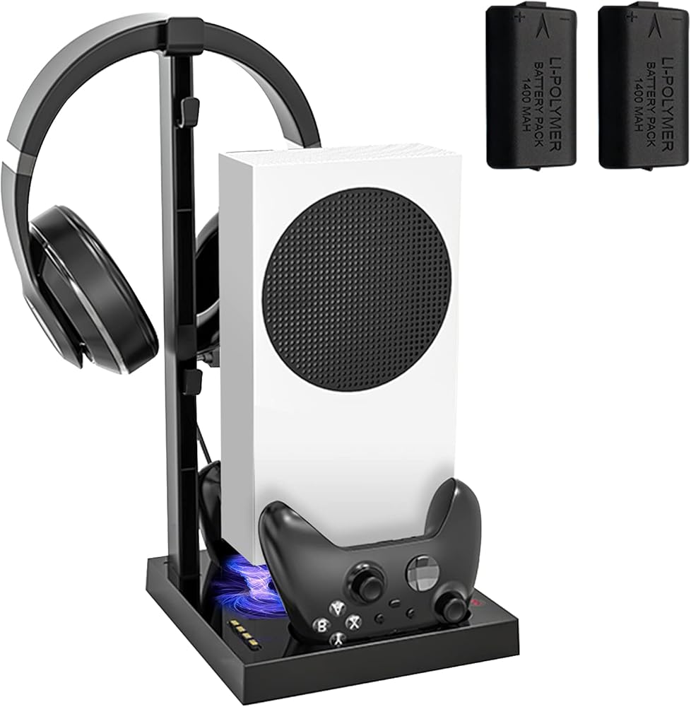 قاعدة حامل عمودية لوحدة تحكم Xbox Series S مع مروحتين تبريد، محطة شحن مزدوجة لوحدة تحكم ارفين مع بطارية قابلة لاعادة الشحن 2 × 1400 مللي امبير في الساعة، حامل تعليق سماعة الراس و4 ملحقات محول من النوع