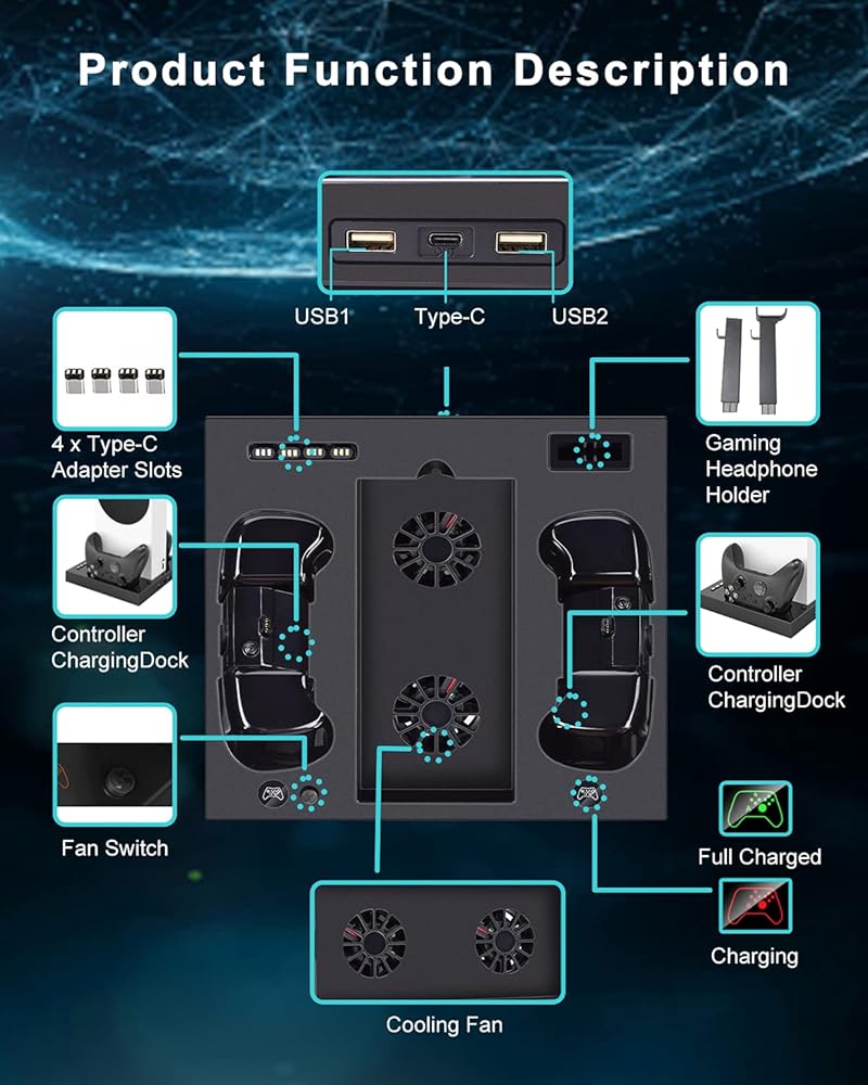 [شاحن ذراع تحكم مزدوج سريع] - حامل تبريد اكس بوكس مع شاحن وحدة تحكم لجهاز اكس بوكس سيريز اس. يأتي مع 4 محولات USB نوع سي قابلة للفصل حتى تتمكن من وضع وحدة التحكم اللاسلكية في قاعدتنا للشحن. يمكن شحن ما يصل إلى وحدتي تحكم سلسلة اكس بوكس اس بأمان في نفس الوقت، ويستغرق الشحن الكامل حوالي 4 ساعات. مع مؤشر شاحن LED شفاف، ضوء أحمر - شحن وحدة التحكم، ضوء أخضر - وحدة تحكم كاملة.