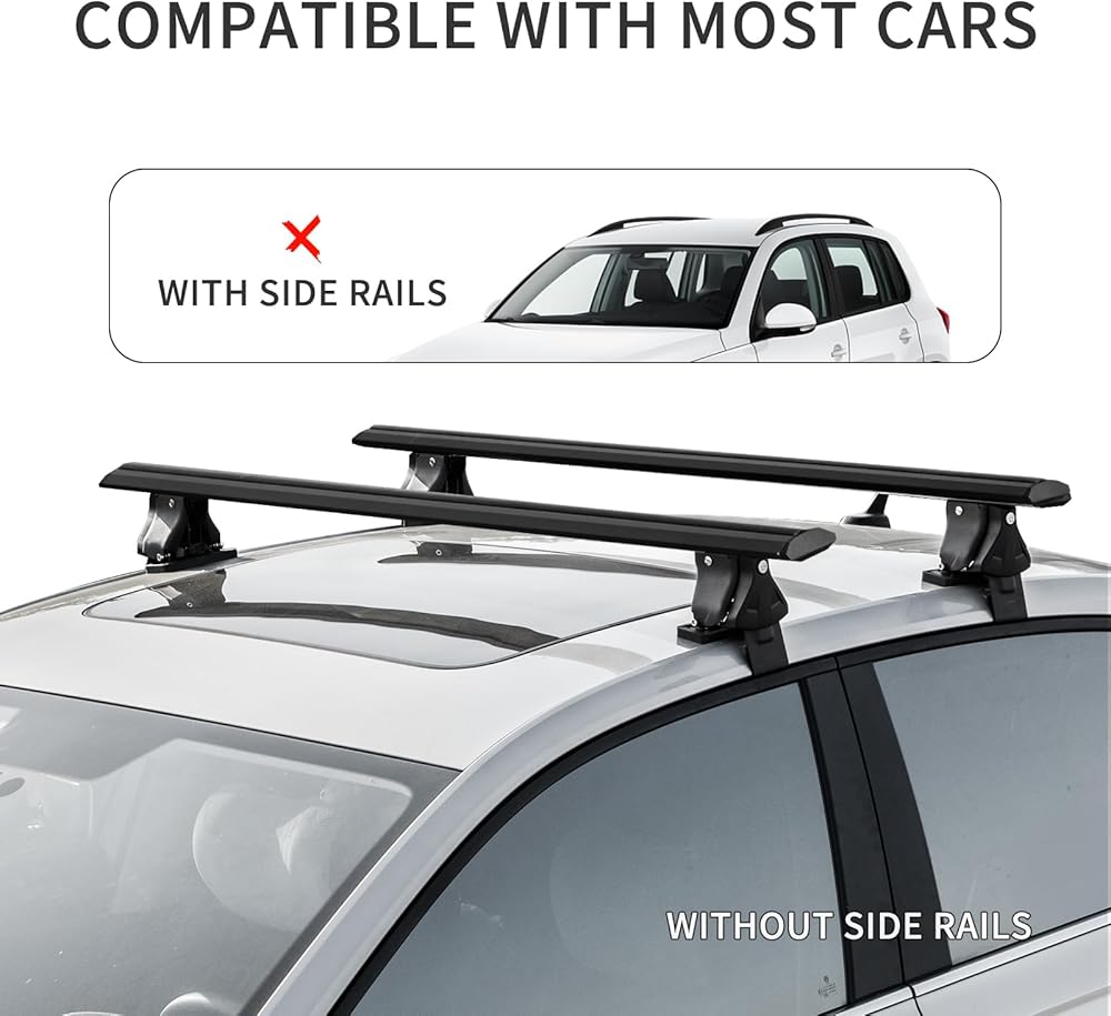 رف السقف العالمي]: يمكن تثبيت رف الأمتعة على معظم السيارات دون أي قضبان جانبية موجودة ، ولكن يرجى الرجوع إلى البيانات التالية لتأكيد ما إذا كانت مناسبة لسيارتك قبل الشراء. عند قياس 55 "من طرف إلى طرف ، يجب أن تكون النطاق القابل للتعديل من الطول المتاح 49" -39 "، ويجب أن تكون المسافة من أعلى بطاقة الباب إلى أعلى السقف أقل من 4" لتناسب طول مقطعنا.