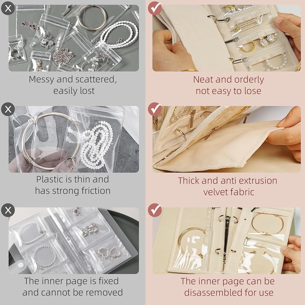 🔒【 الأكمام السحابية الآمنة】 تأتي كل صفحة مخملية مع سحاب ناعم لمنع الانسكابات وحماية الأشياء الثمينة الخاصة بك. إلقاء محفظة المجوهرات في حقيبتك خالية من القلق-تبقى مجوهراتك وضعت وتنظيمها ، سواء كنت في إجازة أو خارج اليوم!