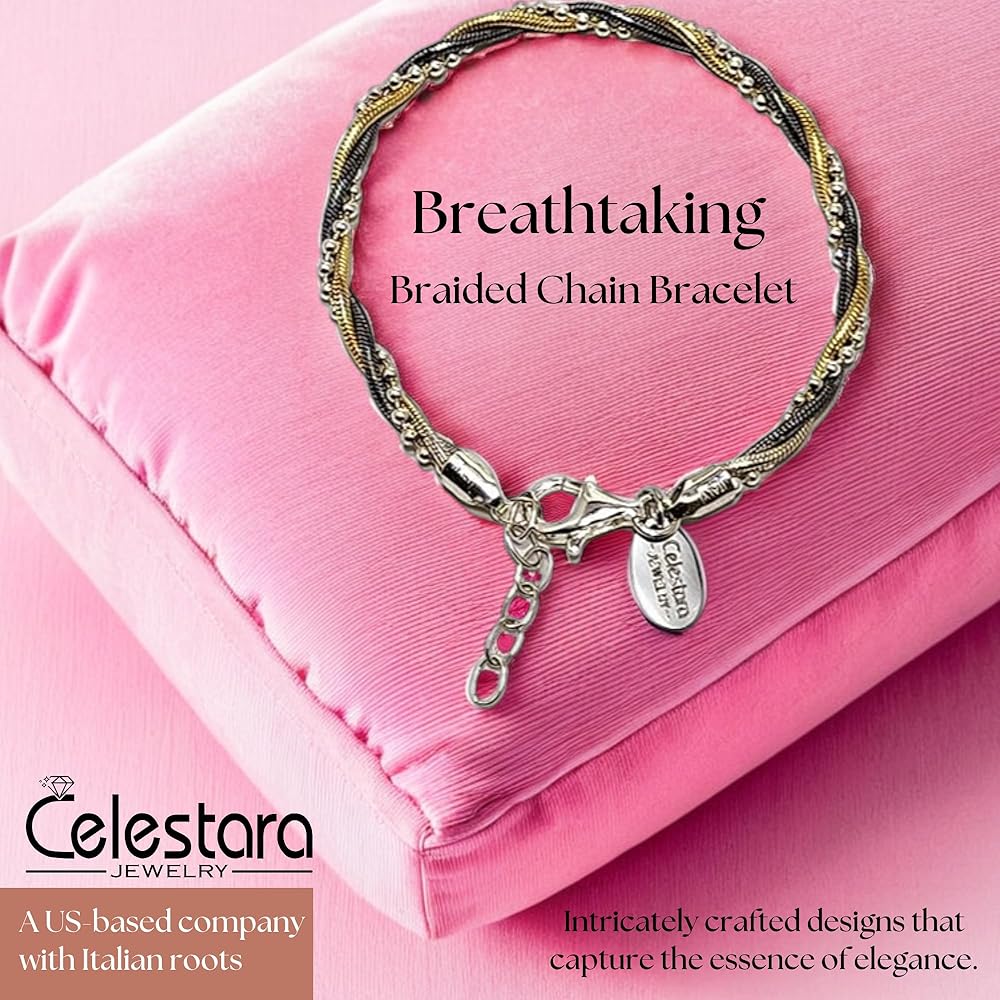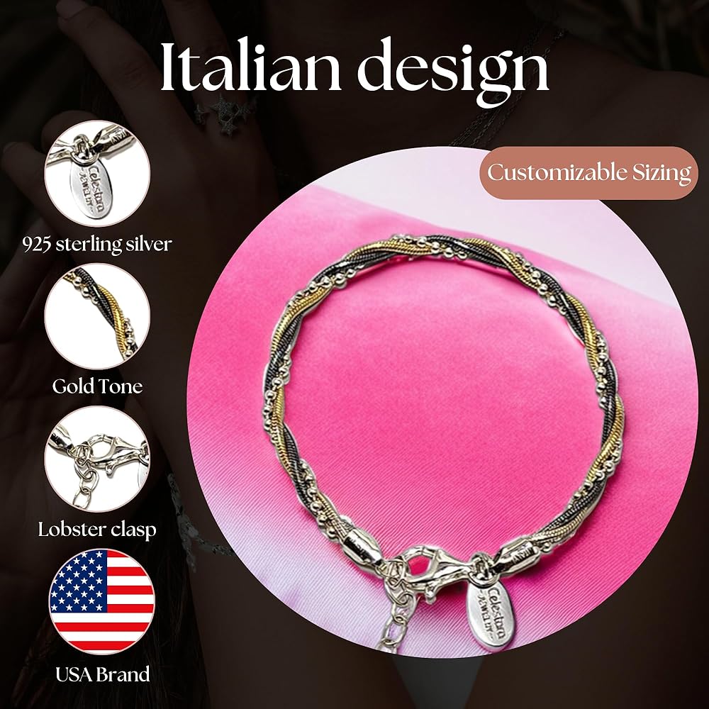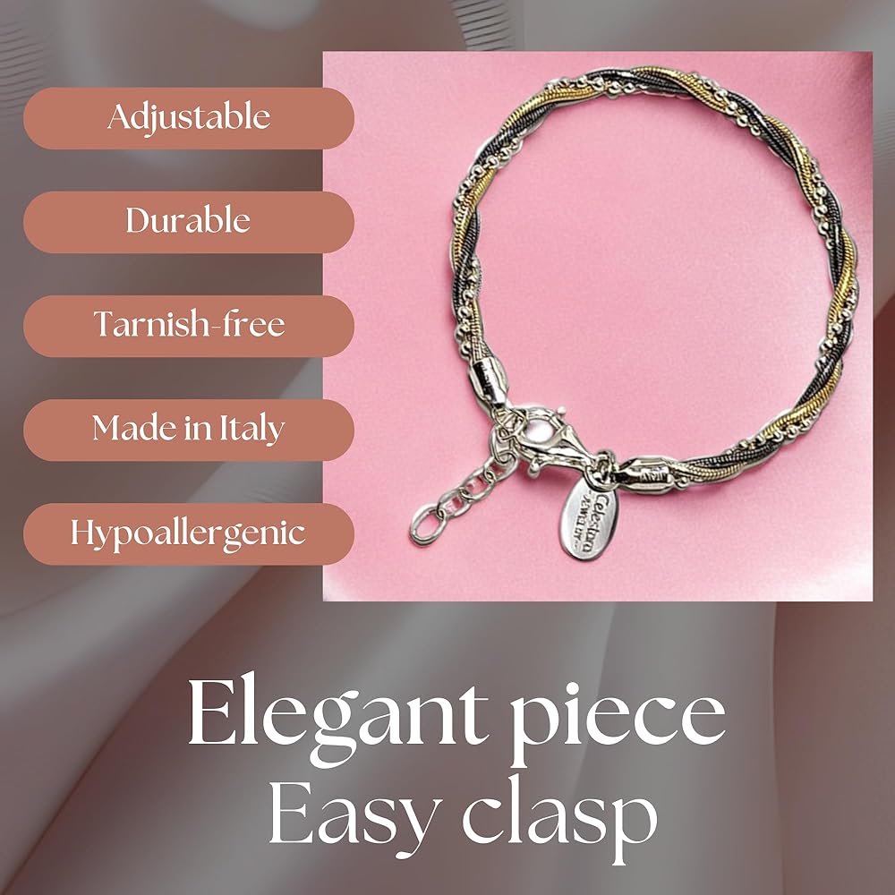 Discover the perfect blend of tradition and elegance with our sterling silver necklace and bracelet set, where Italian craftsmanship meets contemporary style. This exquisite coordinated ensemble features meticulously braided chains enhanced with sophisticated gold tone accents.