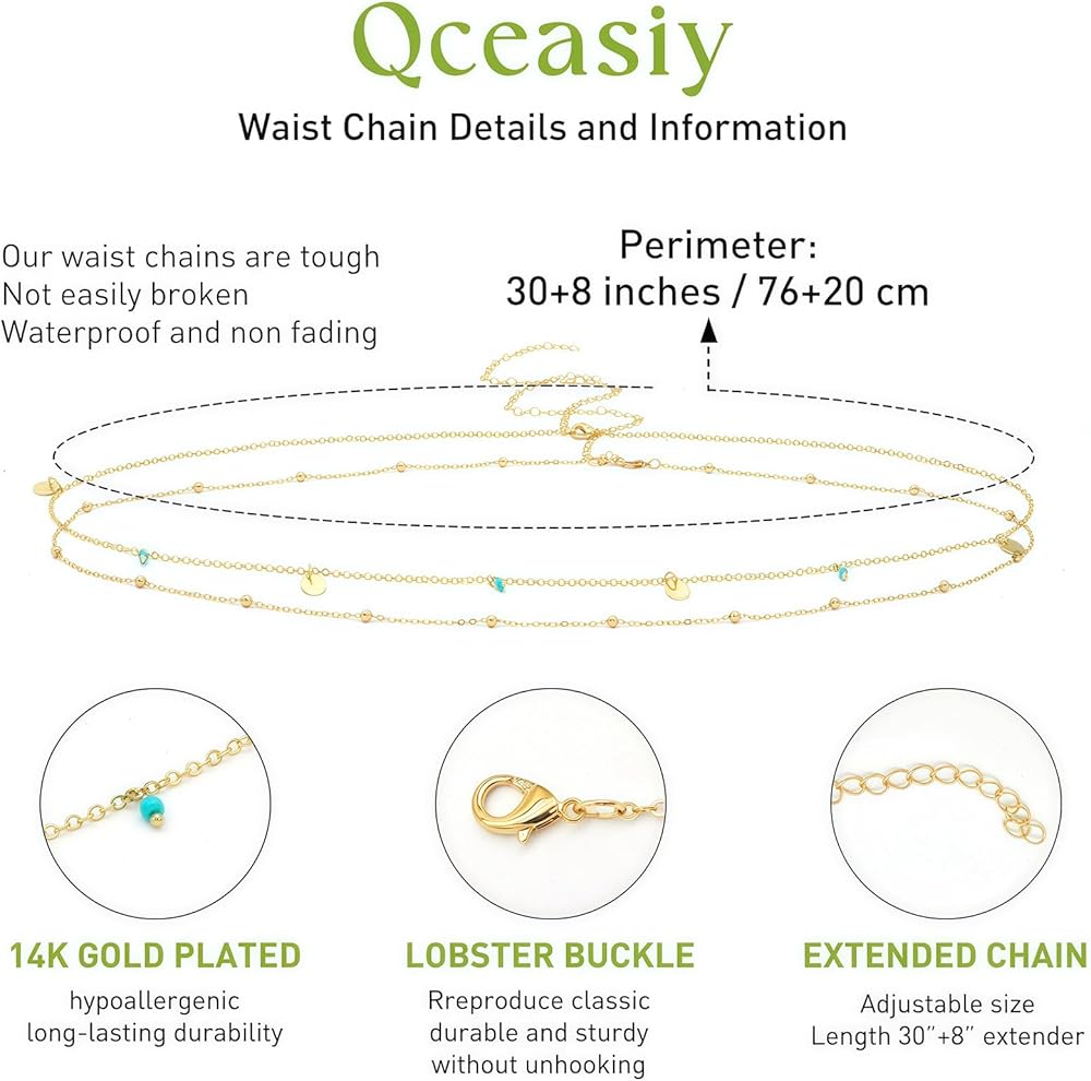 Elegant Design: The 14K gold plated waist chain features many sleek and stylish designs: pearl, beads, sequins, figaro, butterfly, cuban, turquoise stone chains. Multiple options to meet your multiple outfit looks. It is suitable for layering as well as being worn alone for a minimalist touch. This body chain adds a sense of glamour and individuality to your everyday style.
