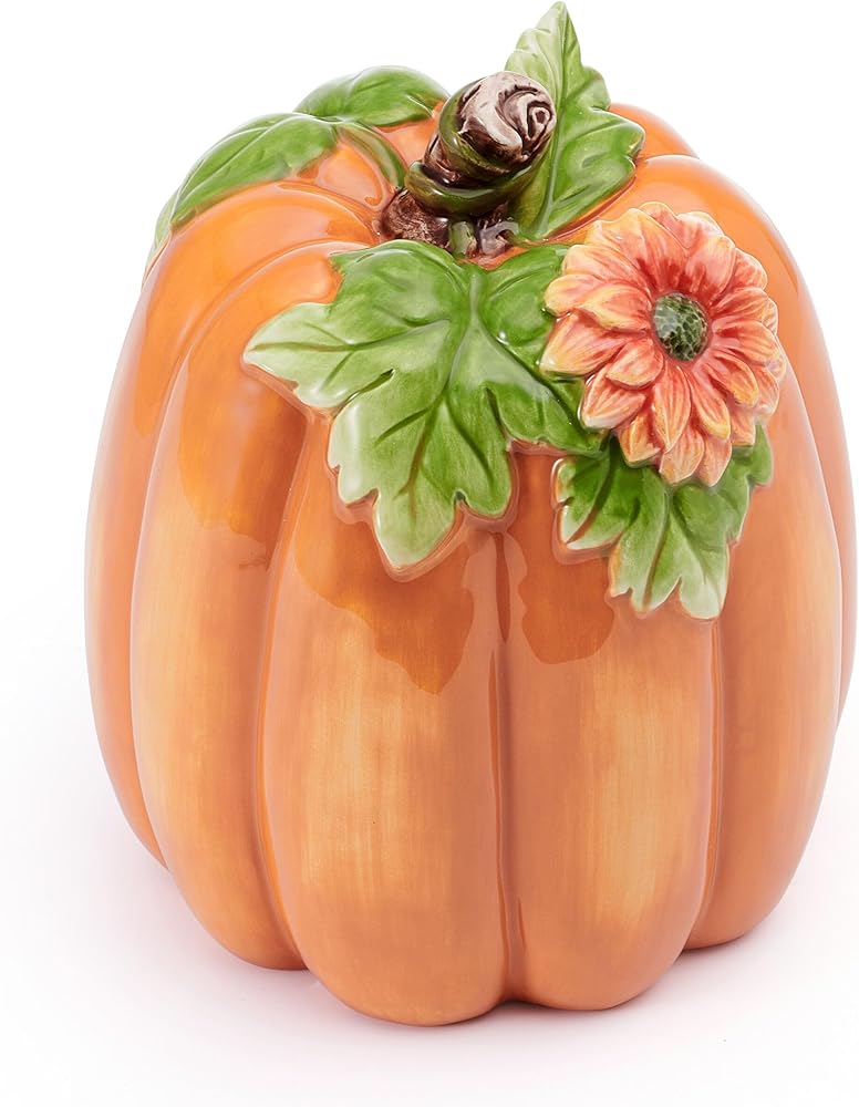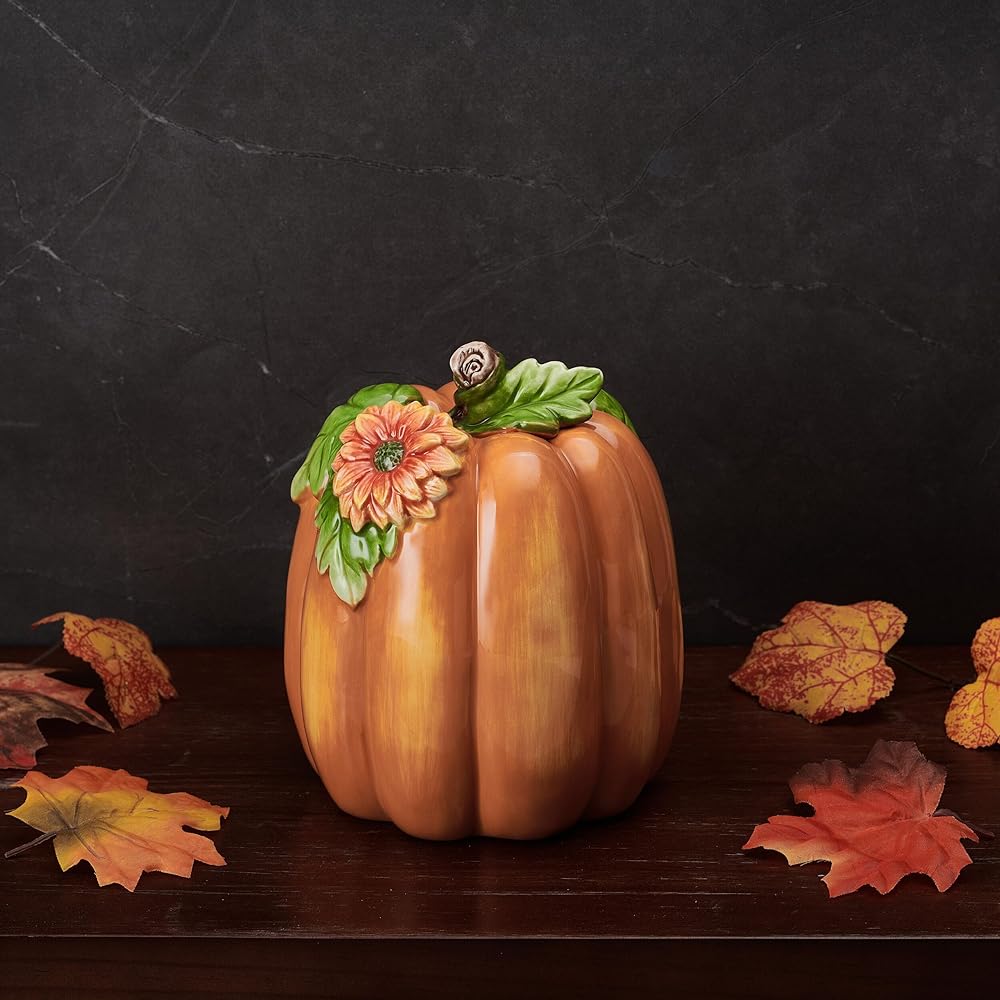 Bring the essence of fall into your home with the Fitz and Floyd Autumn Harvest Side Orange Pumpkin Figurine. This elegant piece adds a warm, festive touch to any room. Perfect for display decorative piece for your mantel, sideboard, dining room table, kitchen table, nightstand or bathroom vanity, this pumpkin figurine captures the vibrant colors and cozy charm of autumn. Handcrafted from ceramic earthenware by Fitz and Floyd artisans, it measures 5-1/2 inches tall and 6-1/4 inches in diameter. Welcome fall into your home with this timeless piece—simply wipe with a damp cloth to keep it looking its best.