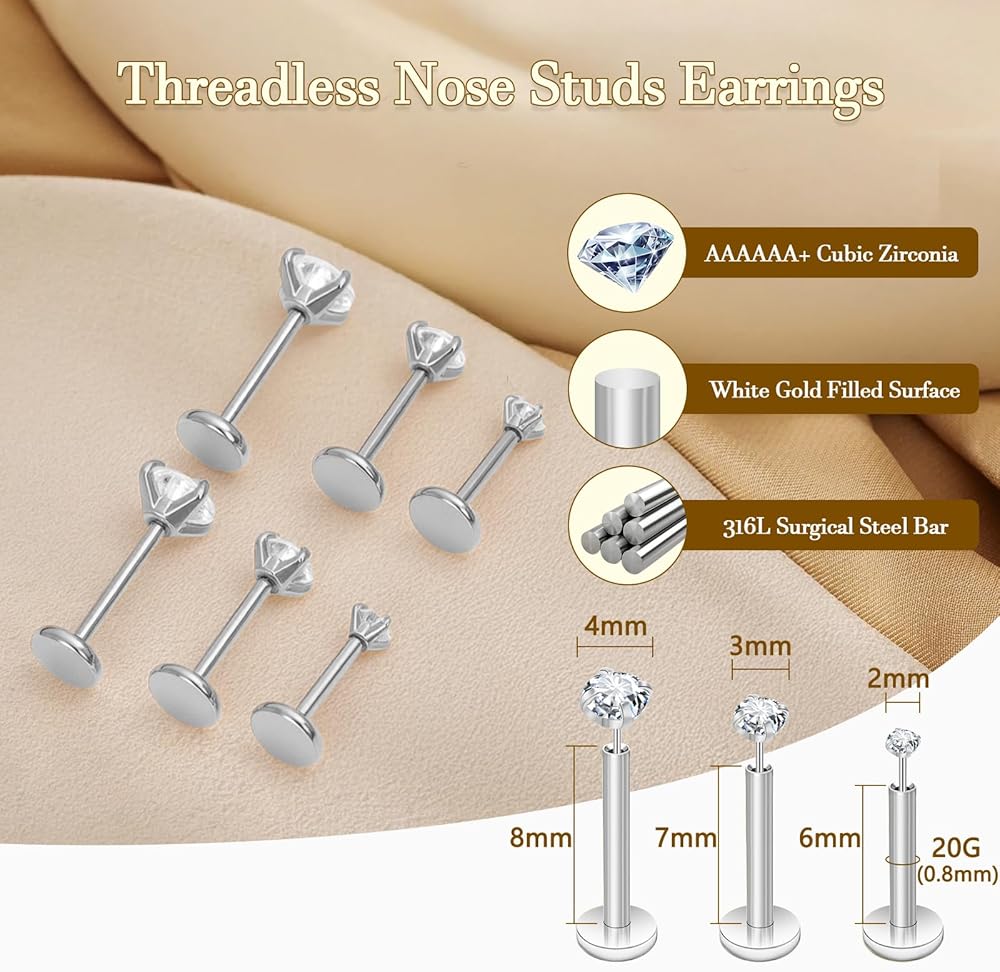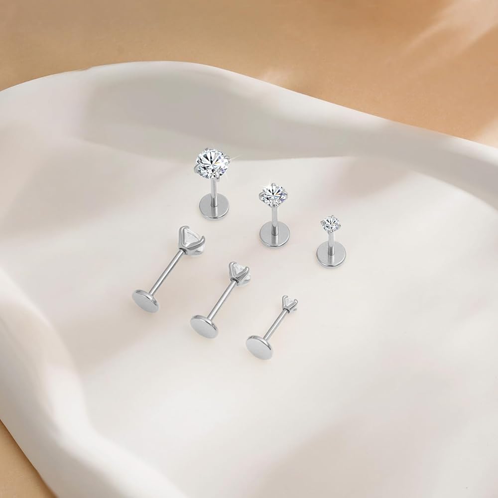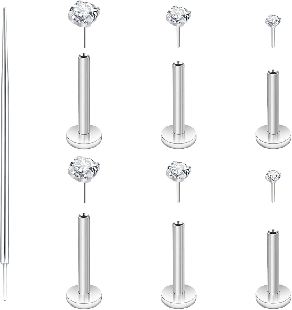 دفع غير مرأى في أقراط مسطحة الأقراط الأنف: حجم المقياس: 20g (0.8 ملم) ؛ طول الشريط: 6mm 7mm 8mm ؛ قطر CZ: 2mm 3mm 4mm ؛ اللون: الفضة المواد: 316L من الفولاذ المقاوم للصدأ. يتضمن ترتيب واحد منشورات Labret 6pcs (3 طول مختلف) ، 6pcs حجم مختلف من نهايات بلا خيط ، 1pcs دبوس إدخال تفتق. منشور مختبر واحد لتناسب كل هذه الأطراف بدون خيوط