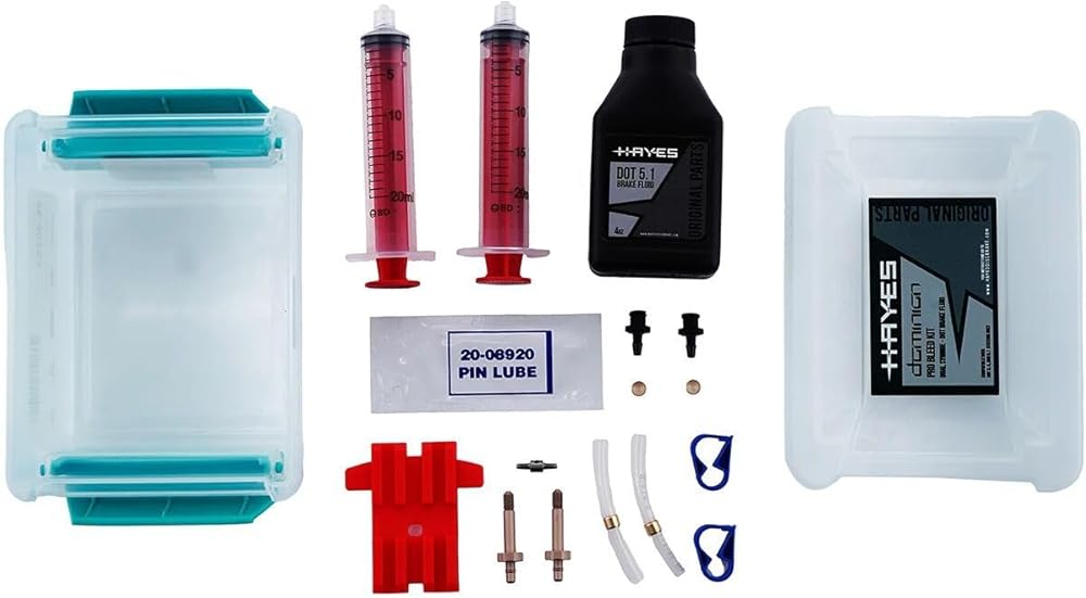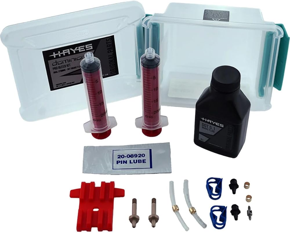 The Hayes Pro-Bleed Kit is a dual-syringe bleed kit, designed for high-performance brake systems. It includes high-performance Hayes DOT 5.1 brake fluid (2oz) and quick connect fittings. The kit also features a reusable plastic container with a locking lid for easy storage.