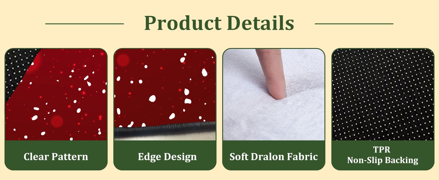 المواد العليا: تتكون سجادة عيد الميلاد Merry من ألياف الألياف الدقيقة البوليستر بنسبة 100 ٪ مع تصميم مطبوع ثلاثي الأبعاد لأنماط واضحة مقاومة للتهوية. تخفف طبقة رغوة الذاكرة عالية الكثافة من ضغط القدم ، وتقنية قفل الألياف تبقي الحواف أنيقة وتتجنب التلاشي.