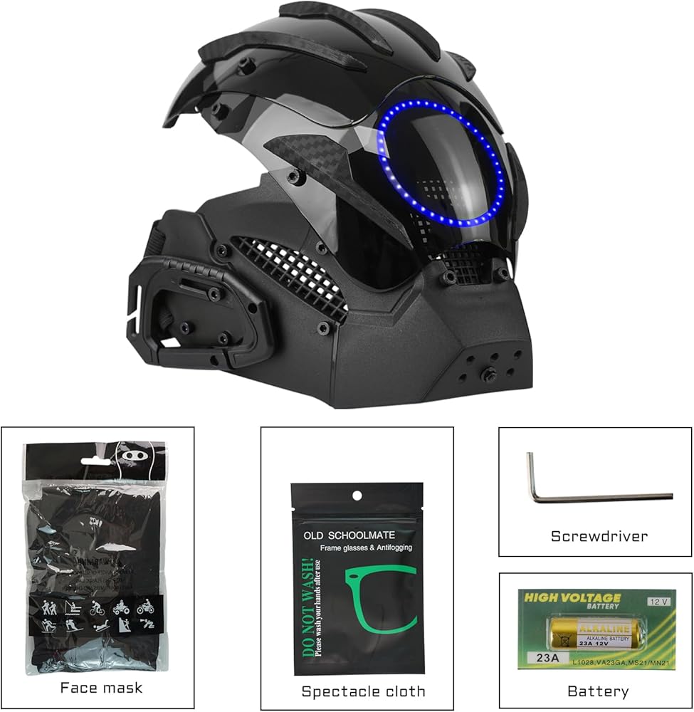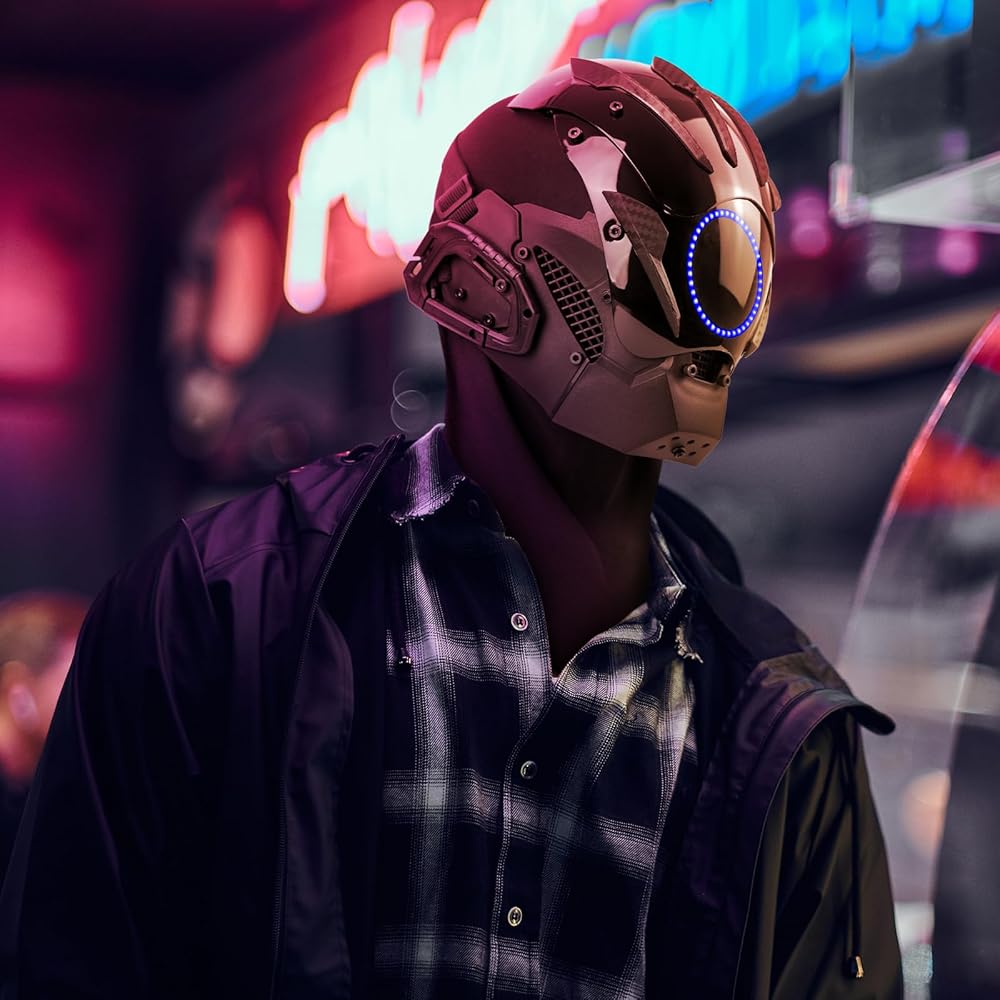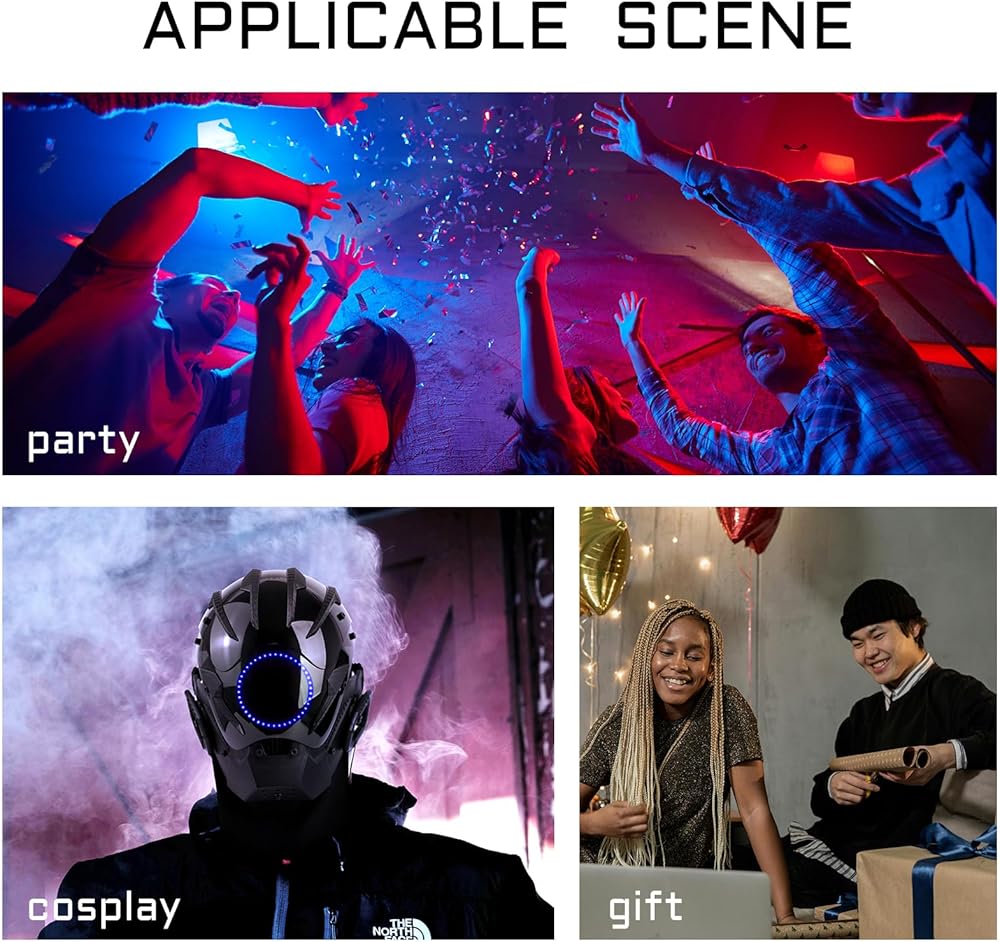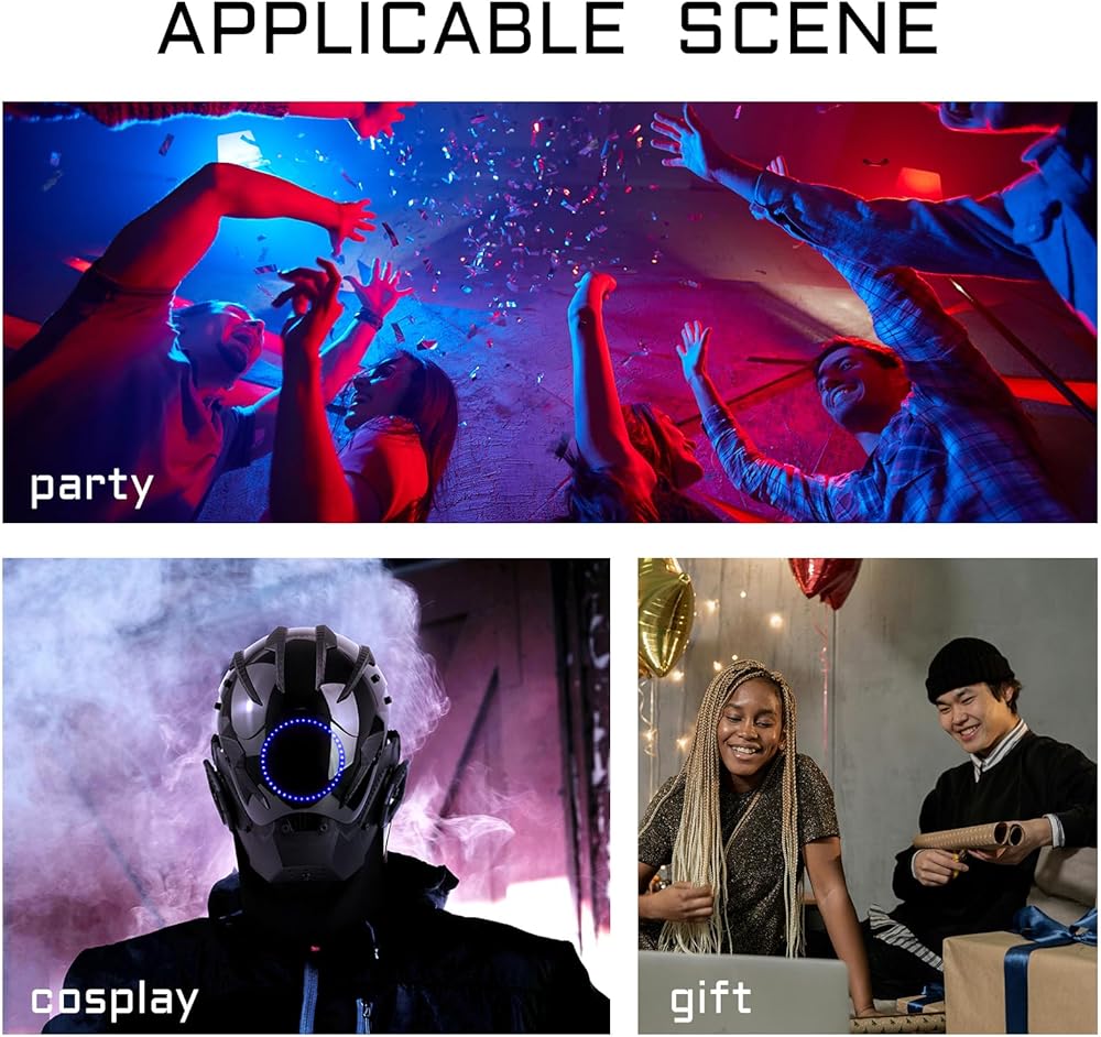 This striking punk helmet mask features vibrant, integrated LED light strips that emit an neon glow—perfect for creating an immersive futuristic aesthetic at raves, festivals, and techwear cosplay events.