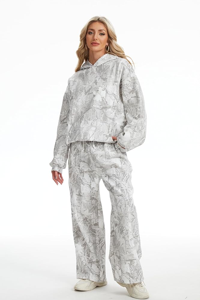 التصميم: تتميز مجموعتنا النسائية المكونة من قطعتين بغطاء للرأس مموه كبير الحجم مع جيب الكنغر وبنطال رياضي كاجوال بأرجل واسعة. يوفر التصميم المريح ذو الكتفين المتدليين مساحة واسعة للحركة في الكتفين والذراعين، بينما يضمن الخصر المرن ذو الرباط مقاسًا جذابًا. صُممت هذه البدلة المموهة للسيدات المكونة من قطعتين لتوفير الراحة، وتجمع بين حرية الحركة والتطبيق العملي، مما يوفر أجواء لطيفة وغير رسمية