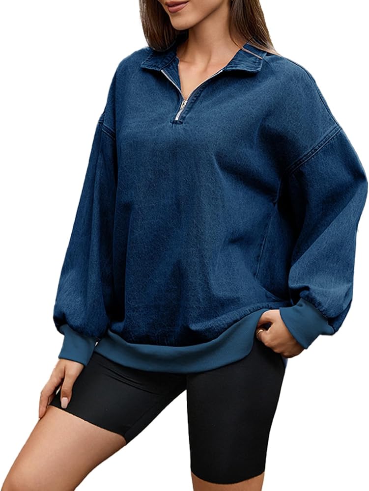 نسيج دينم عالي الجودة: مصنوع من قماش الدنيم عالي الجودة، هذا السويت شيرت قوي ومسامي ولطيف على الجلد. يضمن ثباتًا طويل الأمد وإحساسًا مريحًا.