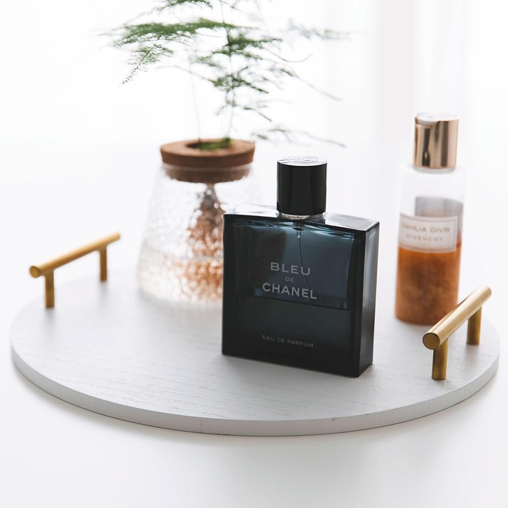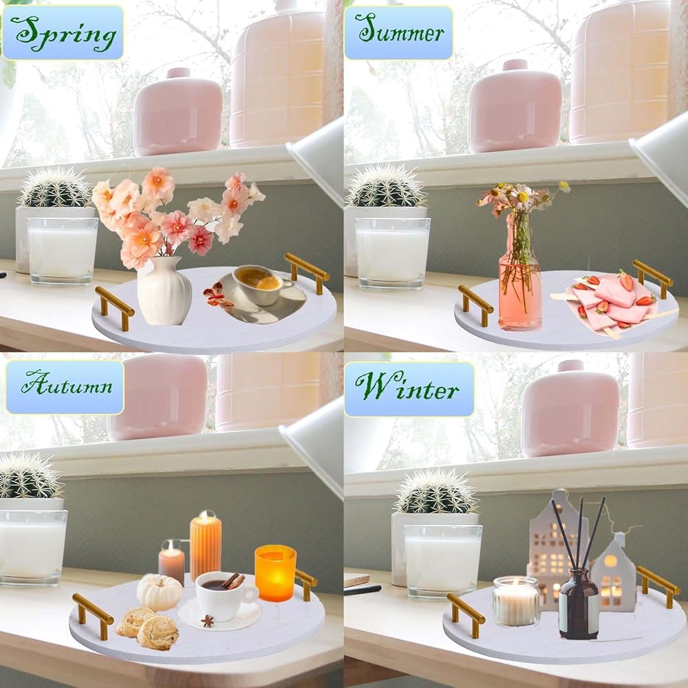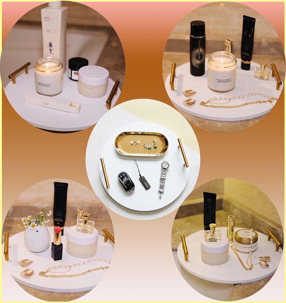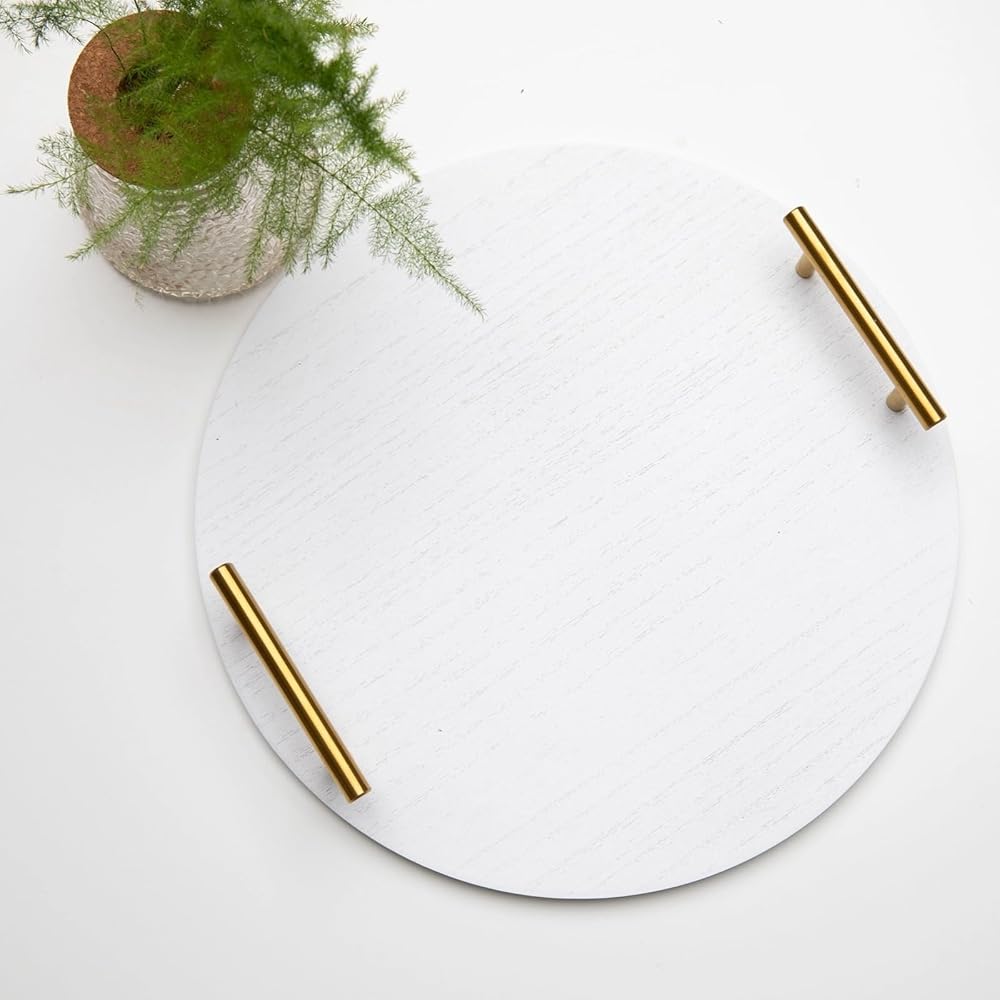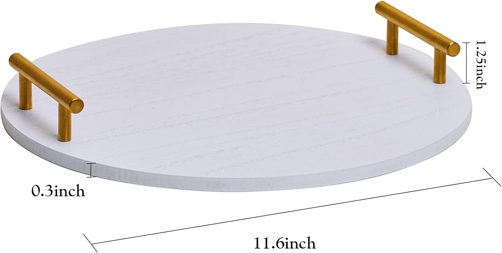 صينية سطح الطاولة المزخرفة: صينية مستديرة بيضاء محددة من ديكو مصنوعة من الخشب الفاخر القوي ومتعدد الاستخدامات؛ يضمن المقبض المعدني الذهبي المحسن حول الصينية ثبات الصينية المزخرفة والتي ستكون لمسة أنيقة في منزلك