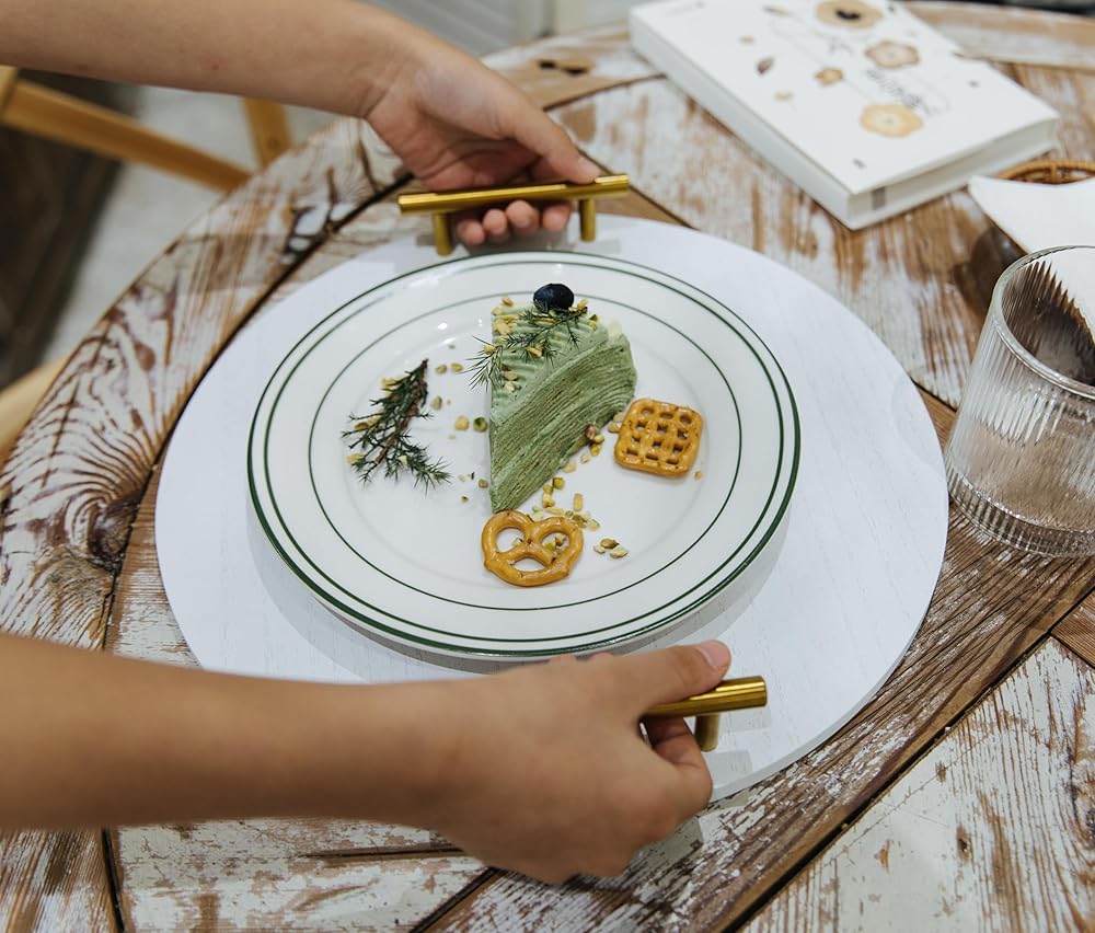 مقبض معدني رائع: يأتي حامل الصينية الدائرية DD بمقبض معدني ذهبي يضيف لمسة عصرية إلى هذه الصينية، مع الحفاظ على إحساس بيت المزرعة الريفي بالصينية الخشبية السفلية المطلية باللون الأبيض؛ قم بمزج ومطابقة ديكور المنزل ذو الصينية المستديرة البيضاء مع الأشياء الزخرفية الأخرى مثل إكليل الخرز وحاملات الشموع لديكور منزلك