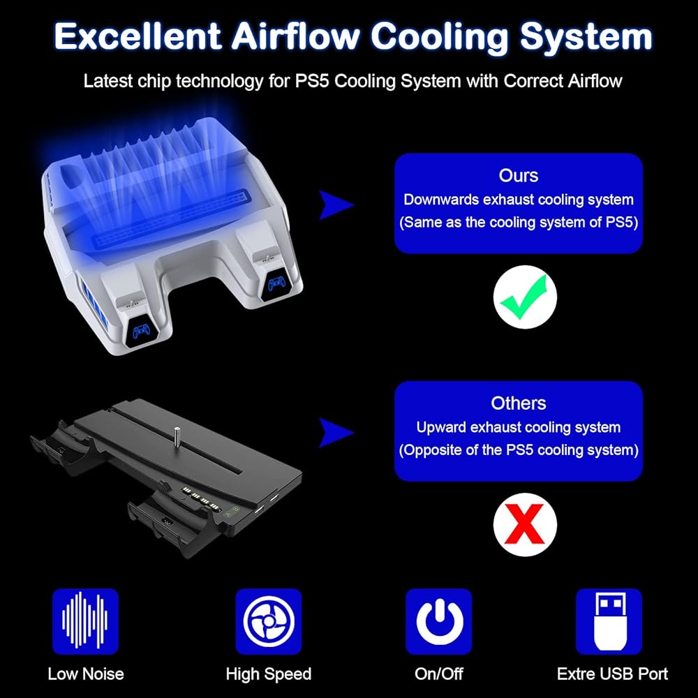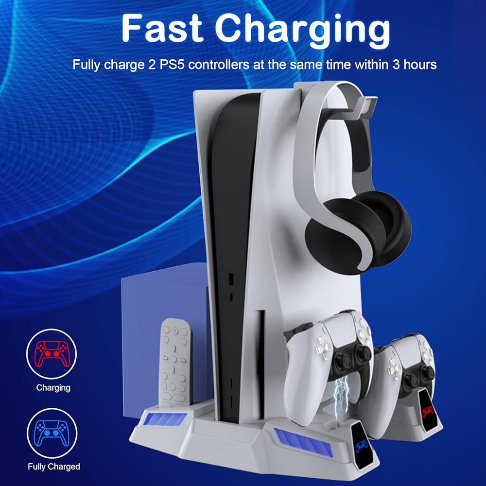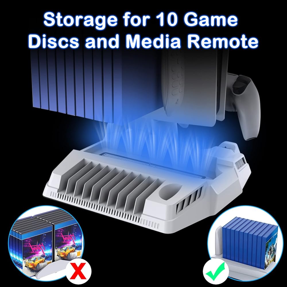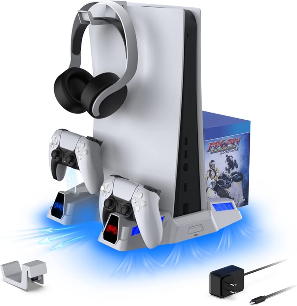 حامل تبريد عمودي TOPAD مع حامل سماعة الرأس ومحول تيار متردد لملحقات PS5، لأقراص PS5 والإصدارات الرقمية وشاحن وحدات تحكم مزدوجة مع مراوح 10 منظم رفوف الألعاب باللون الأسود