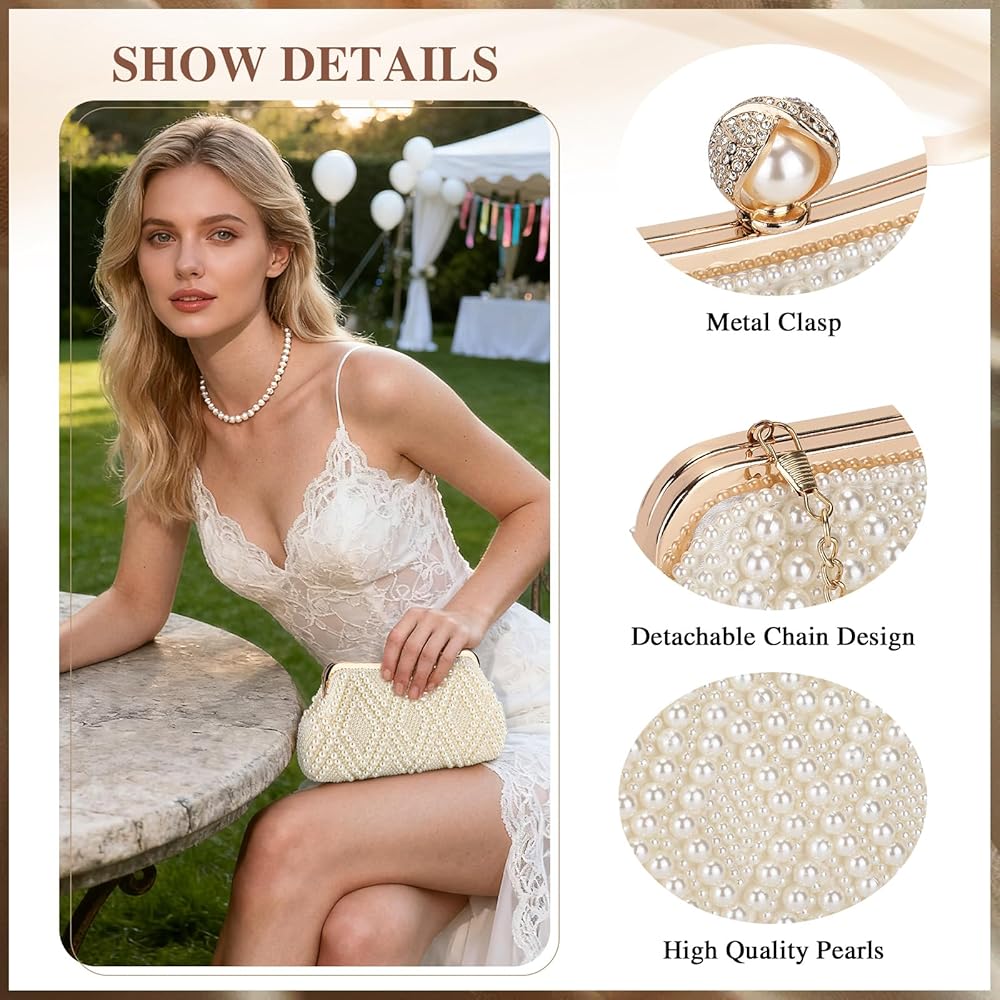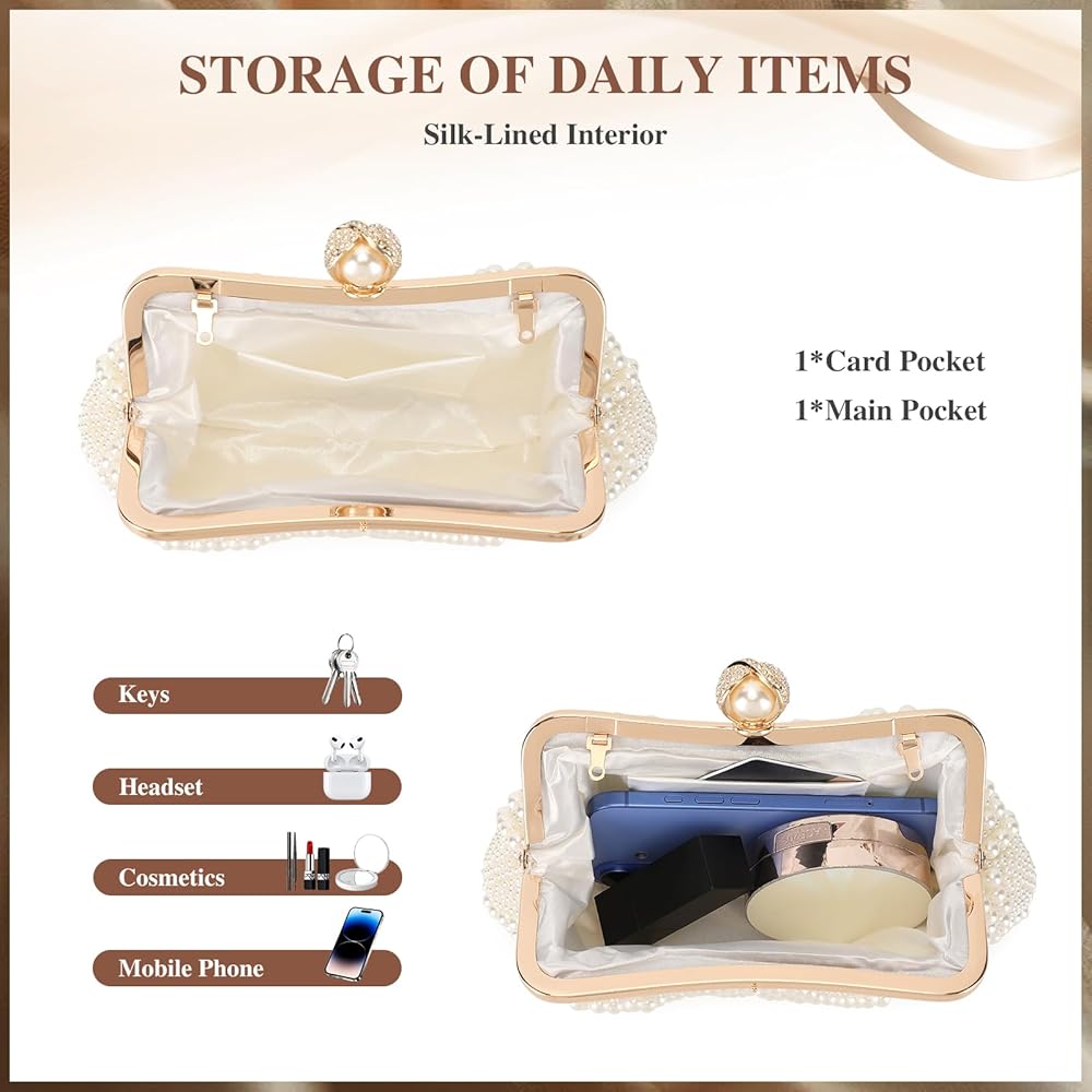 • 【Pearl Clutch Features】Lined with soft polyester for a delicate, smooth touch.The satin exterior is accented with hand-sewn pearls, securely stitched to the clutch for refined elegance. A sturdy metal frame ensures lasting durability.