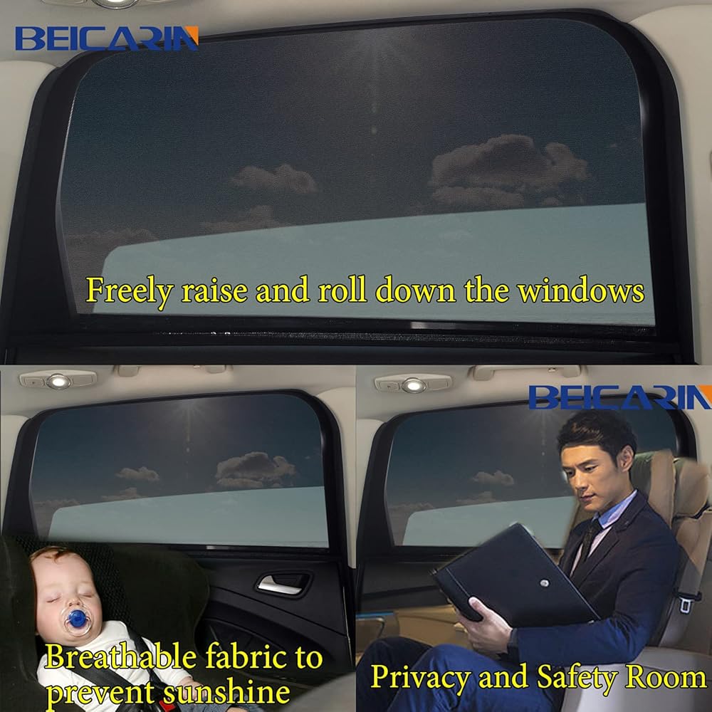 ► 【FREELY RAISE & ROLL DOWN WINDOWS AND PRIVACY ROOM】: The car window sun shade mesh is install on the exterior of the door frame, you can freely raise and roll down the windows. It will create a privacy and safety room for the back seat passengers with this breathable and elastic mesh fabric.
