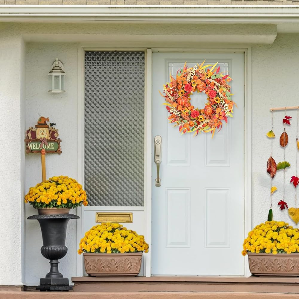 سحر الخريف إلى الأبد: إكليل باب الخريف هذا يكثف دفء وألوان الموسم في منظر طبيعي. إنها ليست مجرد ديكور، ولكنها أنشودة للخريف، تعلق بلطف وفرة الموسم، وهدايا الطبيعة، ودفء المنزل على باب منزلك.