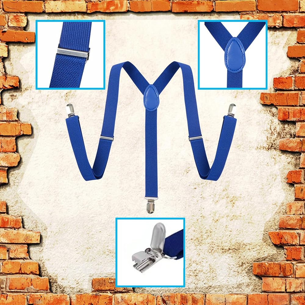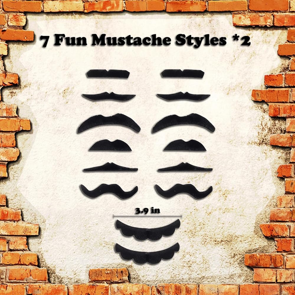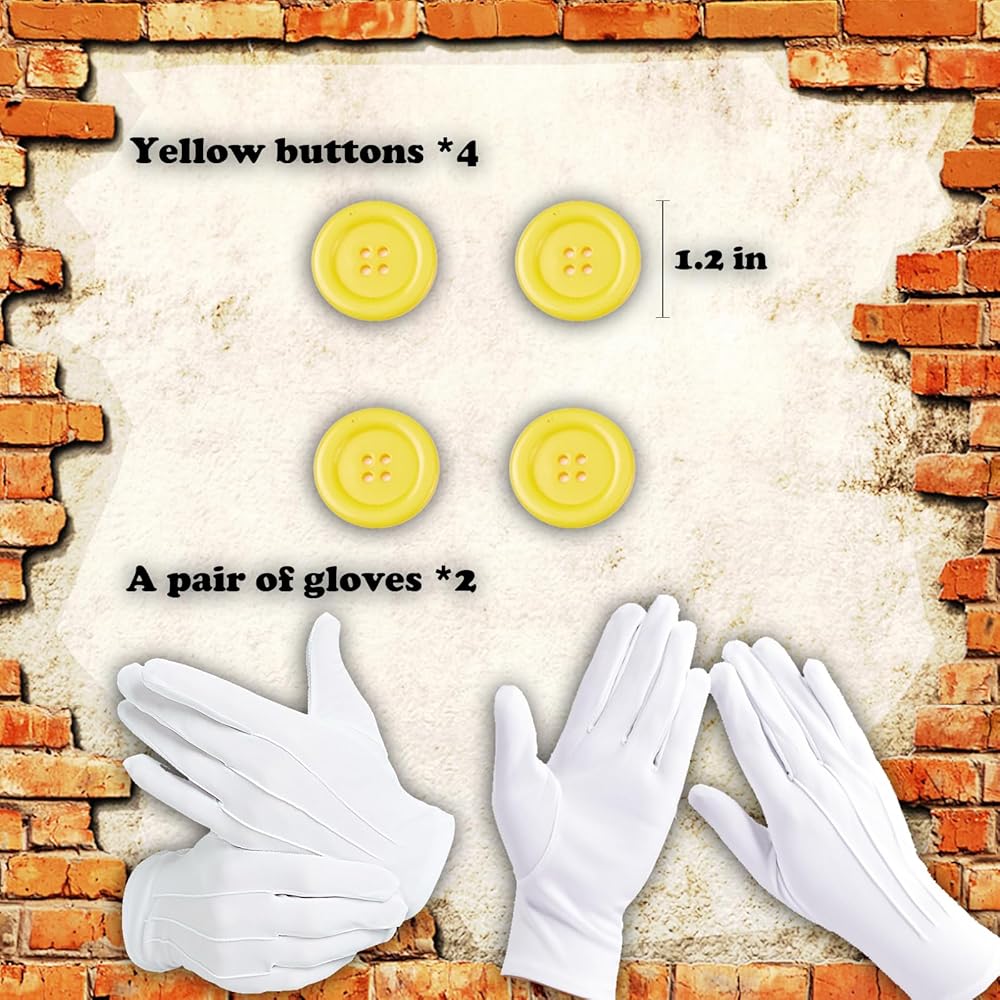 Set Including: a green (L) cap, a red (M) cap, 2 dark-blue elastic suspenders, different styles of fake mustaches, 4 yellow buttons, and 2 pairs of white gloves