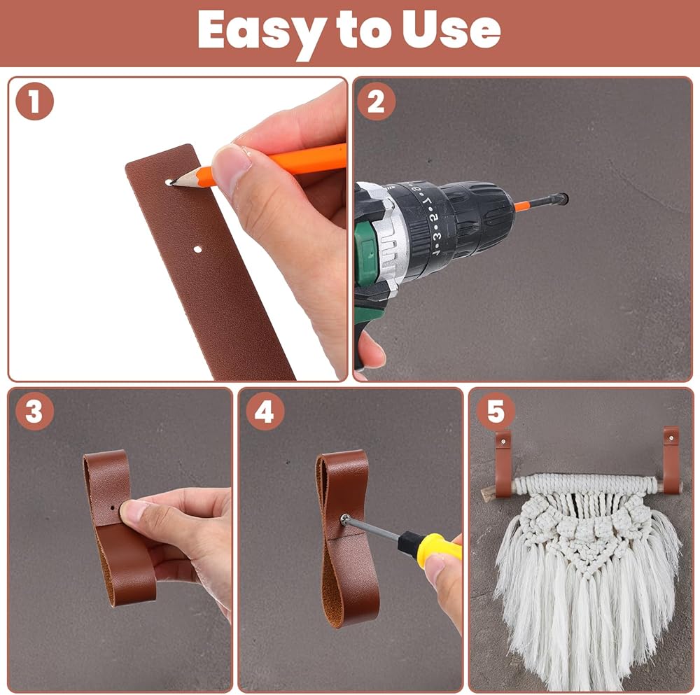 Just push the included nails through the pre-drilled holes and secure the leather hooks to your wall.
