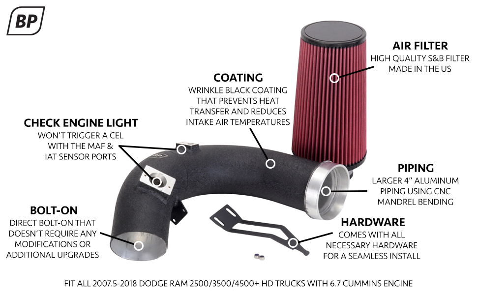 • الفوائد: يوفر مدخل الهواء البارد الخاص بنا بكرة توربو أسرع، واستجابة أفضل للخانق، وكفاءة توربو محسنة، وأصوات سحب رائعة من الديزل سعة 6.7 لتر.