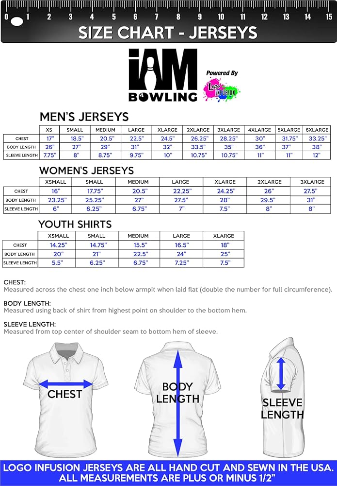 This bowling jersey was produced in Las Vegas, NV using bowling manufacturer logo(s), licensed for use to I AM Bowling, powered by Logo Infusion. I AM Bowling, powered by Logo Infusion is a Global leader in producing and selling dye-sublimated products for the bowling industry. I AM Bowling, powered by Logo Infusion is the jersey sponsor for bowling's Team USA, the official jersey for the Staff of USBC, sponsor of the Junior Gold Championships, and is a product-registered with the PBA and PWBA. Do not use bleach when washing. Wash cold with no fabric softener. Air dry for best results. Do not use in environments that contain abrasive materials, as they may snag the fabric.