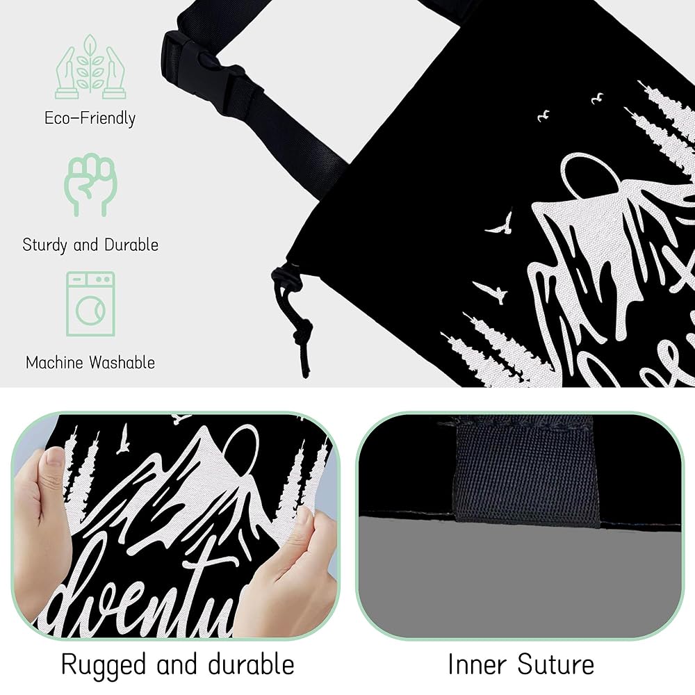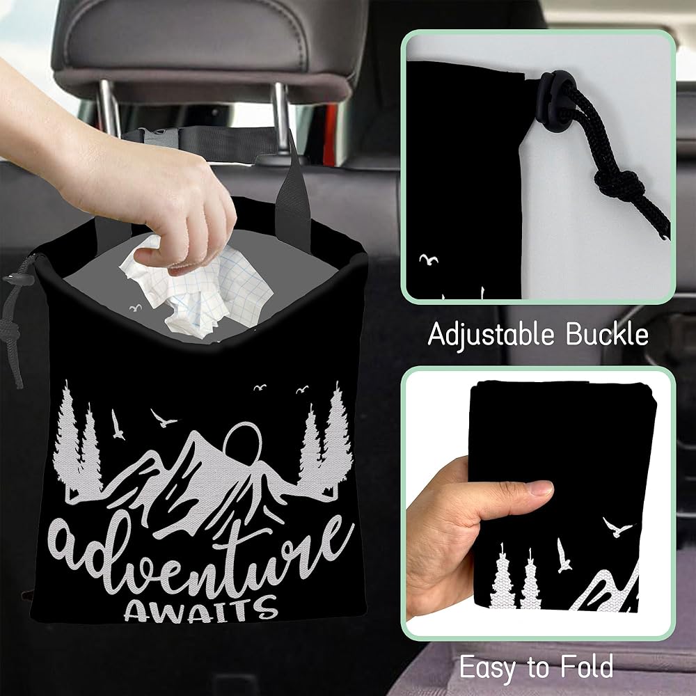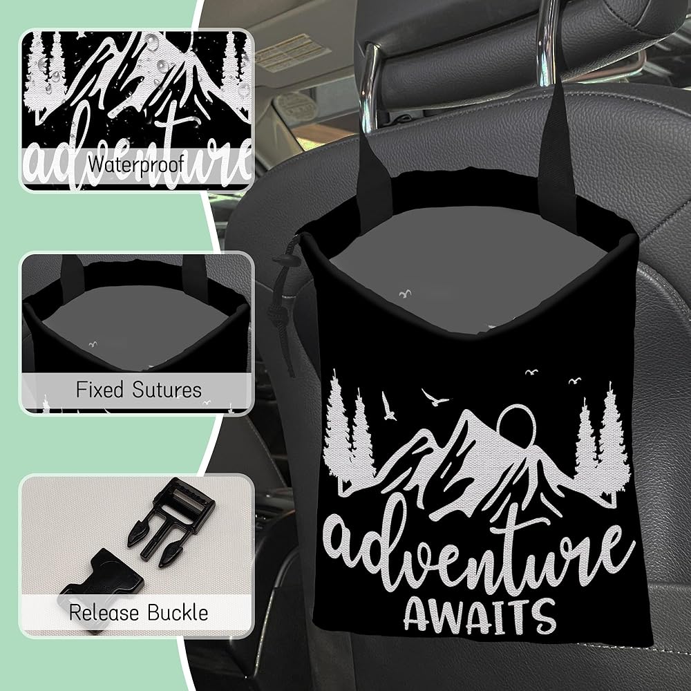 مغامرة تنتظر حقيبة قمامة السيارة، حقيبة قمامة السيارة الصغيرة المقاومة للماء على شكل جبل طبيعي معلقة خلف المقعد، حقيبة قمامة السيارة معلقة برباط مع مشبك قابل للتعديل لإكسسوارات السيارة