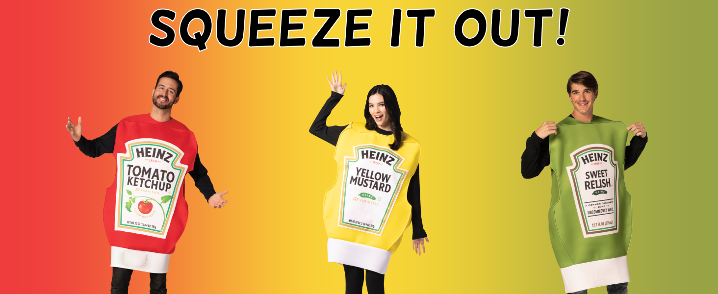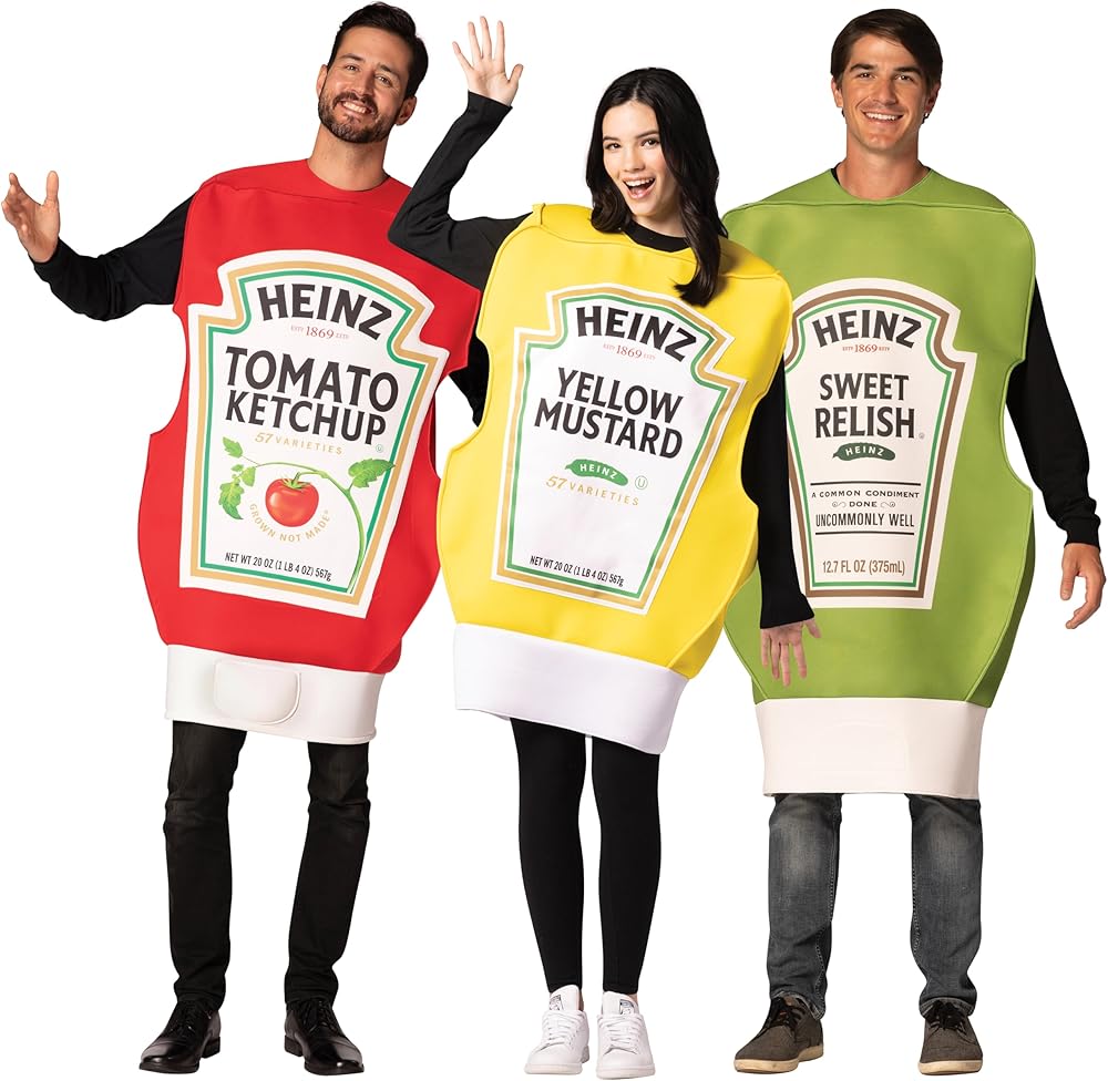 كاتشب مع الأصدقاء: كاتشب مع أصدقائك في عيد الهالوين وارتدي الملابس كالتوابل المفضلة لدى الجميع في زي الهالوين الخاص بمجموعة هاينز الثلاثية من الكاتشب والخردل وريليش!
