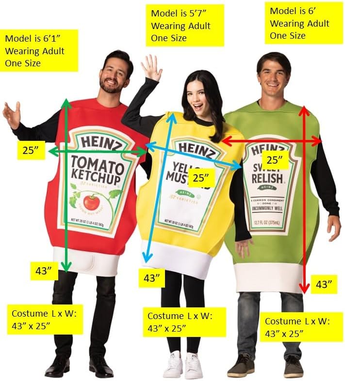 قياسات الزي: قياسات المنتج التقريبية لهذه الأزياء هي Heinz Ketchup، الخردل والكاتشب = 43 بوصة × 25 بوصة (الطول × العرض)