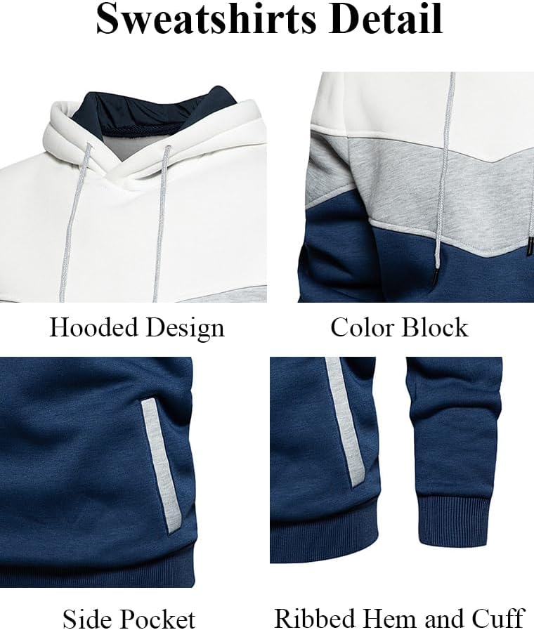 Features: Men's hoodies and sweatpants set design with two slant pockets, color blocking, ribbed hem and cuffs, elastic waist, two side pockets and back pocket.
