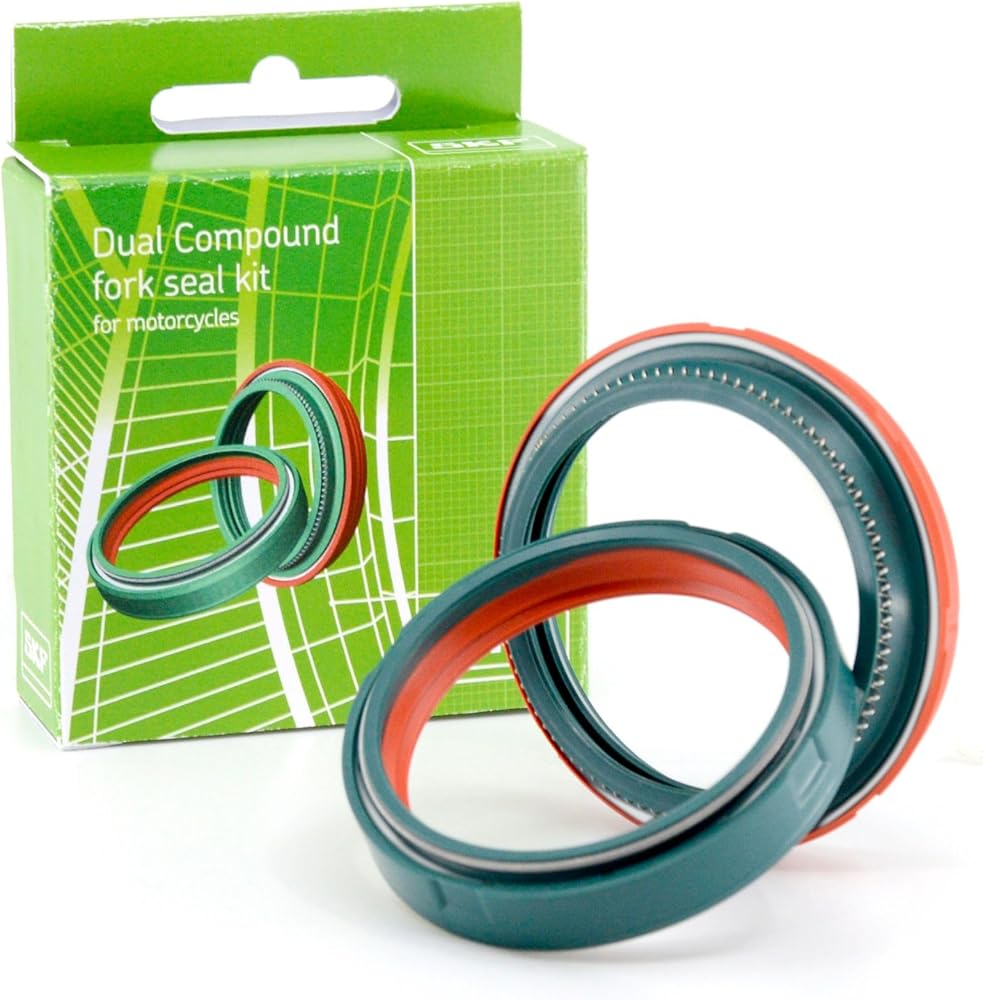 The kit allows for installation on a single fork tube. For a complete forks revision, two kits are required. SKF's innovative Dual Compound fork seals are renowned for their superior performance in terms of smoothness, extreme protection capability against water and dirt, and for providing the rider with the best riding experience. These seals are manufactured using SKF's proprietary "Super Low Friction NBR" compounds, known for their advanced properties. They feature a robust internal metal stamping that provide proper support for the sealing lips, ensuring less fork stiction and exceptional durability.The two compounds used, green and red, have unique characteristics. The green part is tough and durable while maintaining high surface grip properties without compromising friction. The red part, on the other hand, is soft and flexible, making it the optimal solution to adapt to any micro-imperfections of the fork tube while allowing exceptional fork movement.The fork wiper has undergone a complete redesign and is equipped with a self-cleaning, open-wind spring to increase sealing pressure. The new spring allows mud to flow through the open coil, ensuring a stable radial load on the sealing lip and optimizing contact pattern to the shaft.The new metallic component inside the dirt scraper and oil seal provides essential structural integrity to optimize the functions of the sealing lips. These lips are redesigned on both components to ensure maximum contamination exclusion and to enhance followability on the shaft.This product represents the most advanced solution in the fork seal market, offering a unique combination of materials and design that ensures durability, superior performance, and adaptability in all operating conditions.