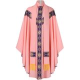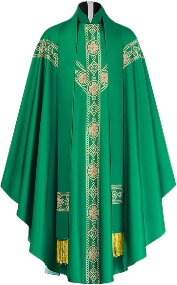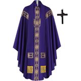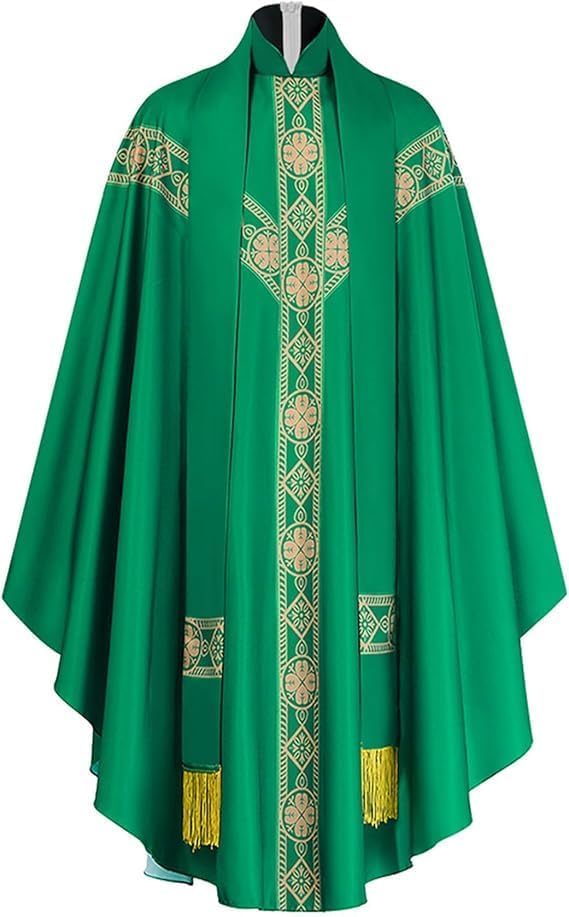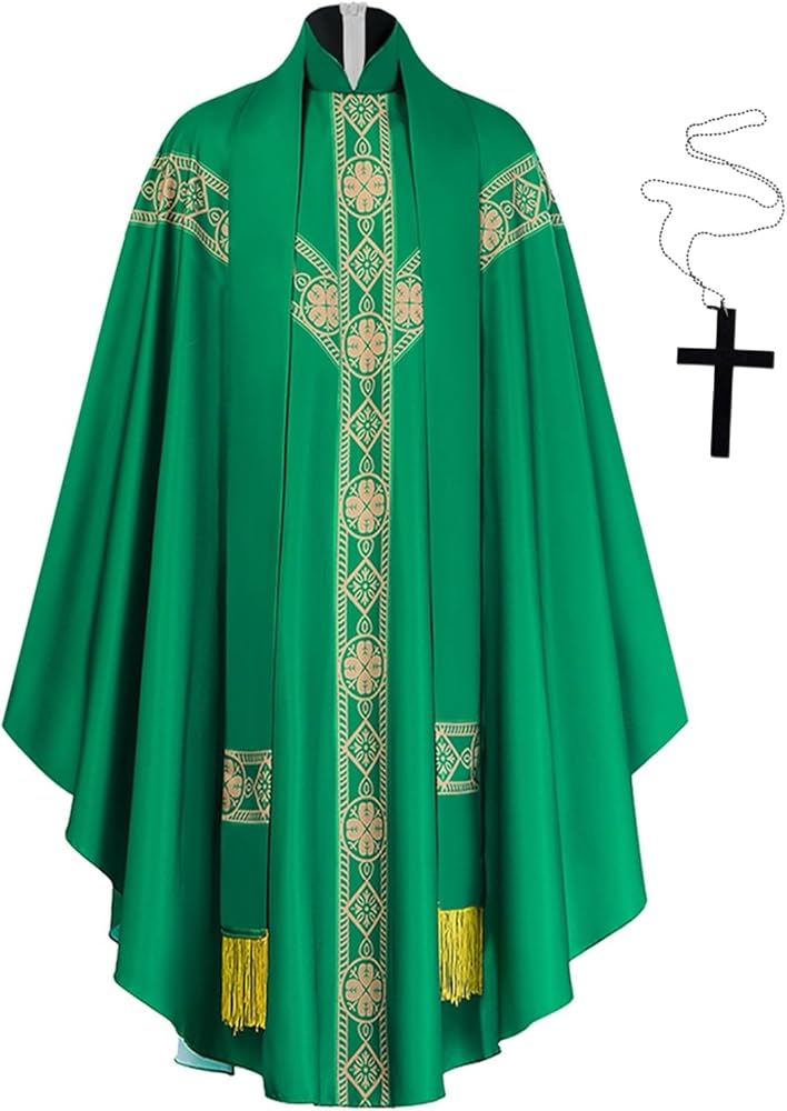Elevate your liturgical ceremonies with this exquisite Catholic Priest Chasuble set, featuring 5 distinct color options to honor different religious occasions. Each vestment robe is adorned with elegant gold-toned stole showcasing intricate quatrefoil and geometric patterns. The flowing design includes a traditional high collar, graceful draping, and yellow fringe accents at the hem. The set includes chasubles in pure white, royal purple, emerald green, and rose pink, allowing for proper observance of various liturgical seasons. The accompanying stole and decorative cross complete this ceremonial ensemble. The classic design maintains traditional Catholic symbolism while providing dignified, flowing movement during Mass celebrations. Perfect for parish priests, these vestments combine reverence with practical functionality for regular church services.