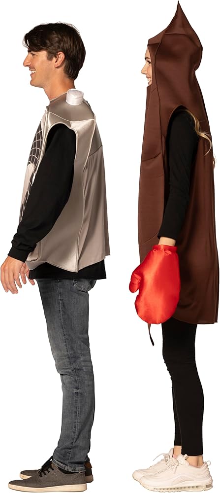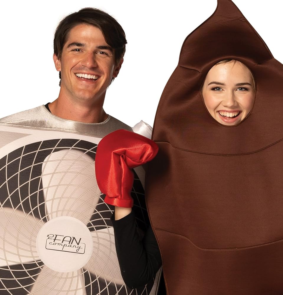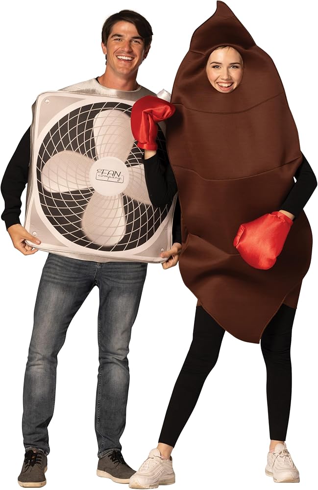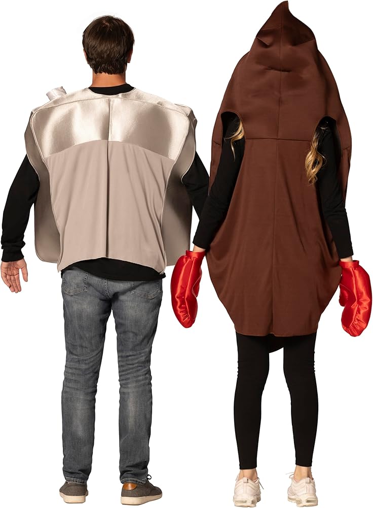 INCLUDES: This couples costume includes two foam tunics and boxing gloves. The foam tunic is in the shape of a fan pulls on over the head and features a fan graphic print on the front only with a polyknit back. The foam tunic is in the shape of poop featuring an inside head lining and stuffed boxing gloves. Does not include the shirt and pants.