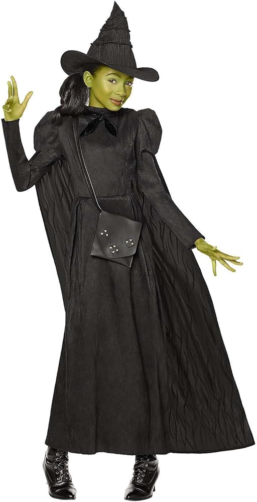 This Halloween, defy gravity as the wicked witch Elphaba! This officially licensed costume includes a sleek black dress, pointed witch hat, matching cape, and a black crossbody bag to store your witch essentials.