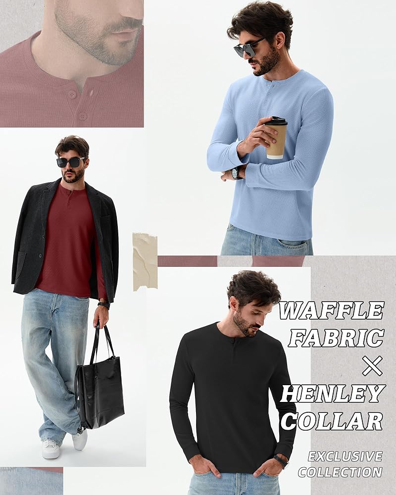 Soft & Comfortable Material: Our men's waffle henley shirts are made of 60% Polyester, 30% Cotton, 10% Spandex, a classic waffle knit fabric that offers long lasting comfort and warmth. It has a soft and skin friendly touch and will not shrink
