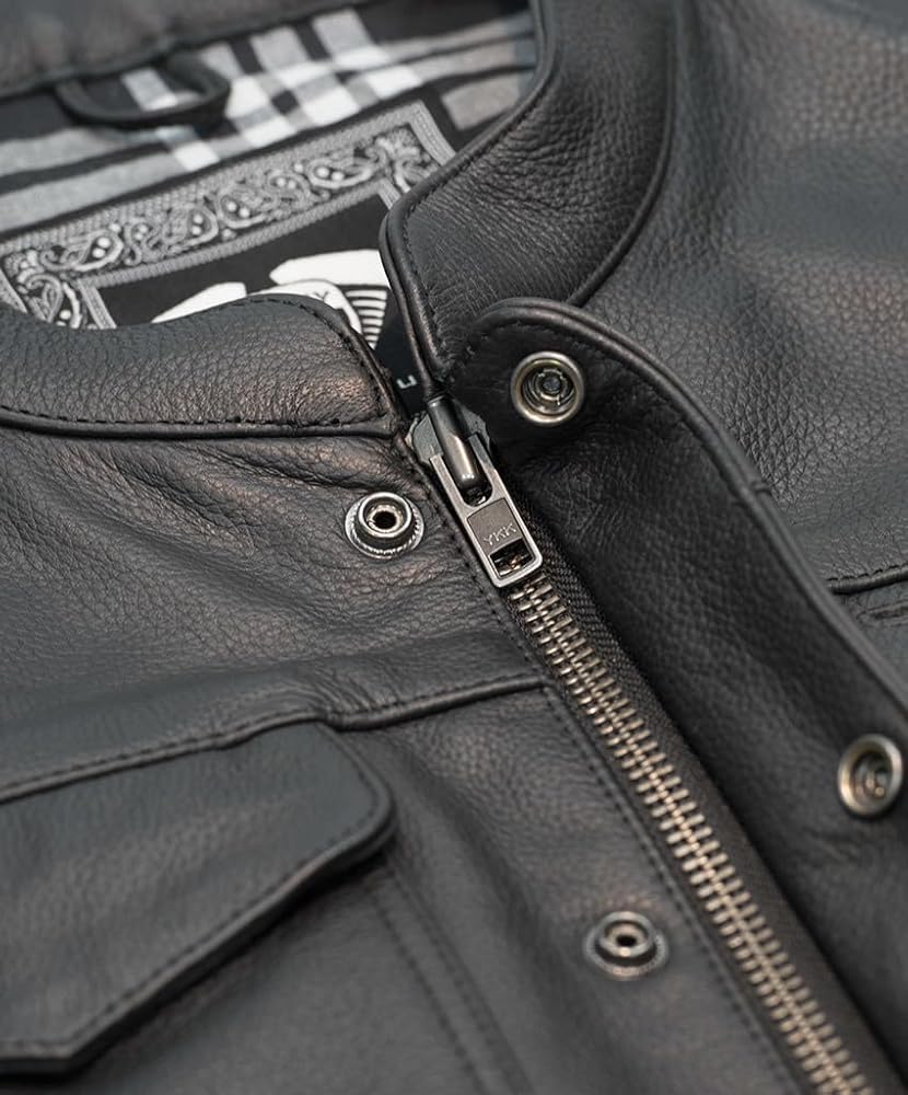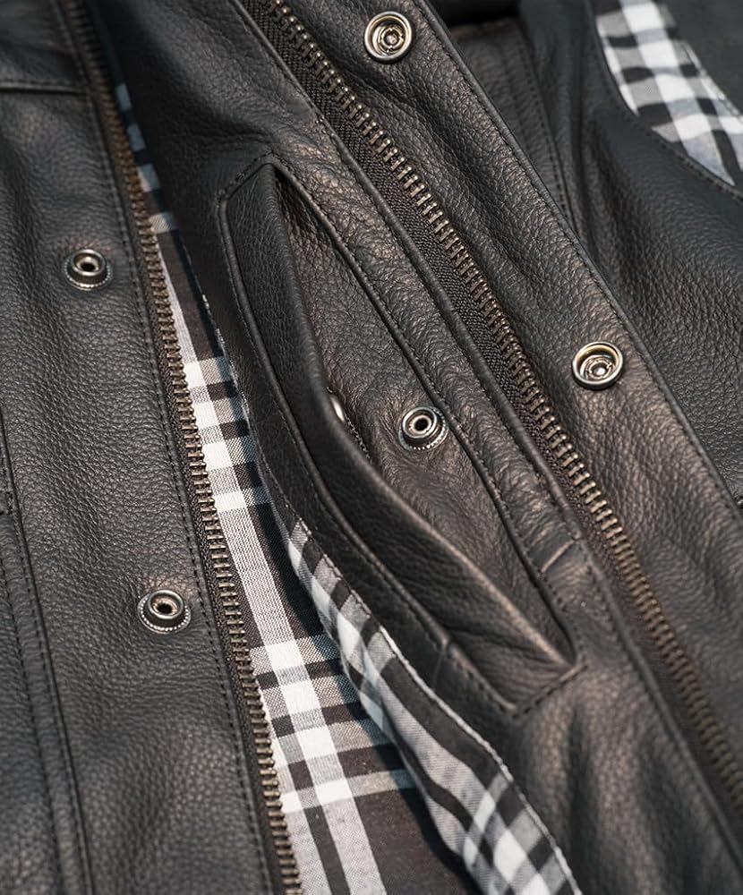 Staying protected has never looked this good. Made of genuine leather, our outerwear vest protects against abrasion and damage. Its rugged construction keeps the wind at bay, while its knife and concealed-carry pockets keep you safe. For comfort, it offers snap waist adjusters and zippered handwarmer pockets. Made of 100% genuine leather and featuring chest pockets and a YKK main zipper, this vest has just as much style as it does protection.