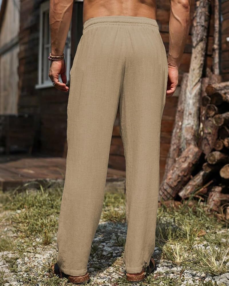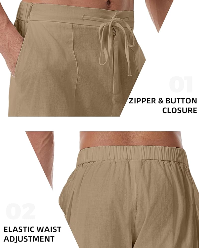 مزيج من القطن والكتان عالي الجودة: 85% قطن، 12% كتان و3% سباندكس، سراويل الكتان الكاجوال للرجال توفر التهوية وخفيفة الوزن مع ضمان تجربة ناعمة ومريحة. مناسبة تمامًا لحرارة الصيف والأمسيات الباردة