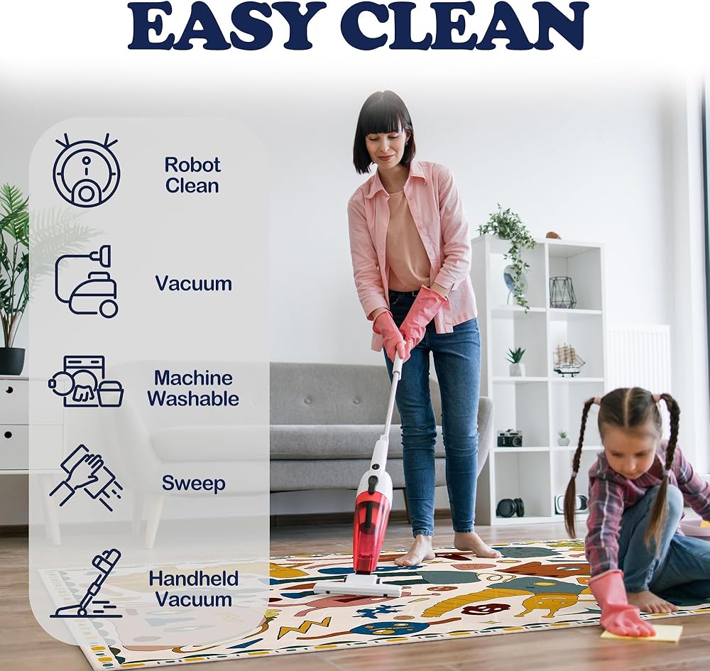 سهل التنظيف ومتين للعائلات المشغولة: يتيح لك السطح المقاوم للبقع مسح الانسكابات أو الفتات أو الأوساخ في ثوانٍ بقطعة قماش مبللة - لا حاجة إلى مواد كيميائية قاسية أو غسيل في الغسالة! يتحمل التصميم المتين الاستخدام اليومي (مواعيد اللعب، وقت الوجبات الخفيفة، وقت القصة) - مما يجعله خيارًا عمليًا للأسر المزدحمة.