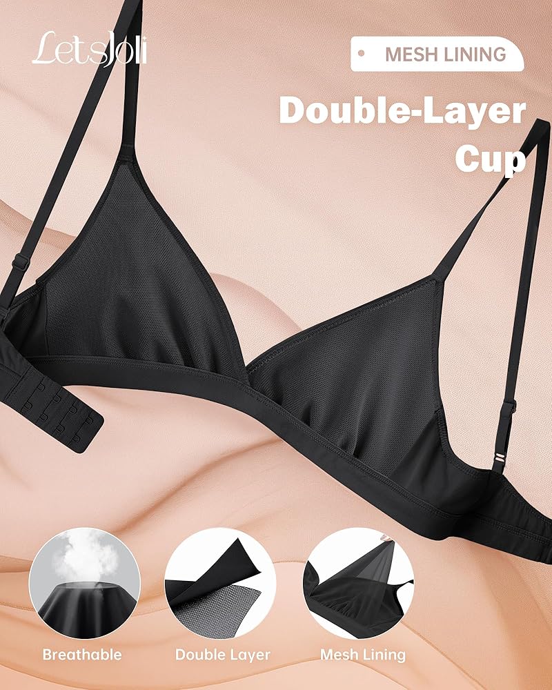 نعومة تشبه السحابة: تمتع بالسهولة طوال اليوم مع حمالة صدر مثلثة مصنوعة من 76% نايلون 20D مزدوج ستة و24% سباندكس، ناعم كالحرير ولطيف بشكل لا يصدق على البشرة، ويوفر تنفسًا وخاليًا من التهيج من الصباح إلى الليل - راحة نقية يمكنك الشعور بها مع كل حركة