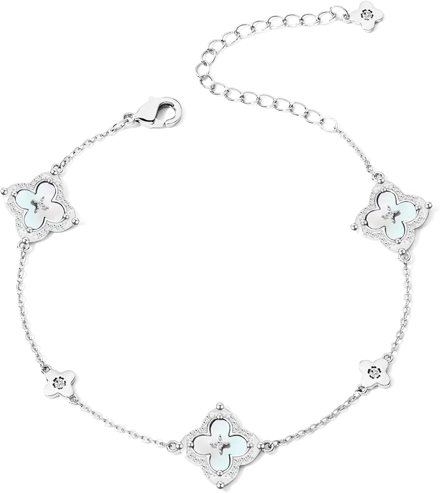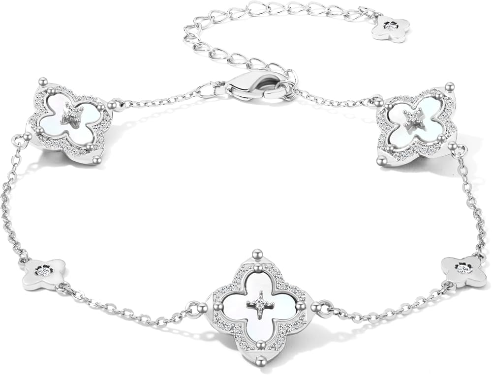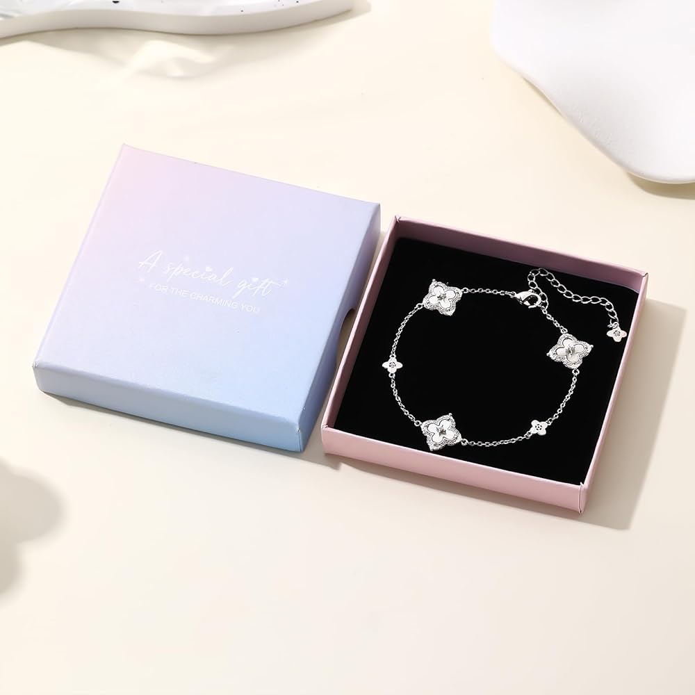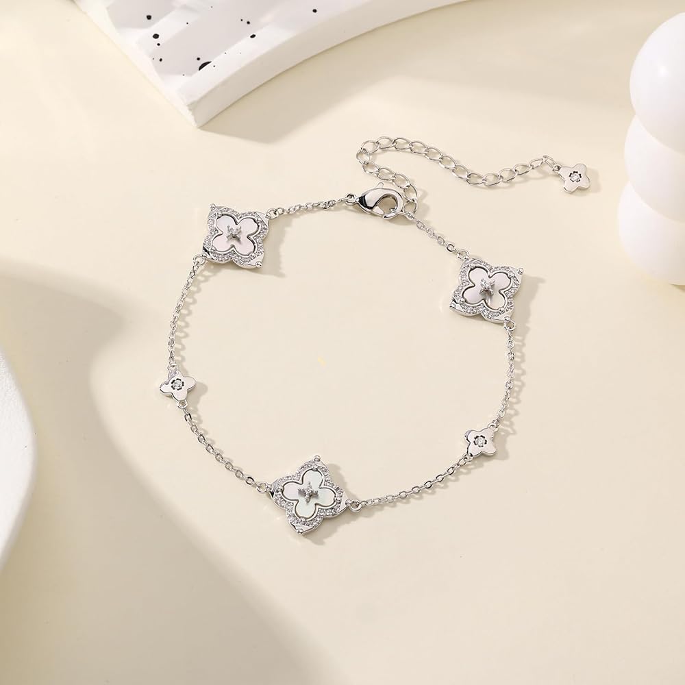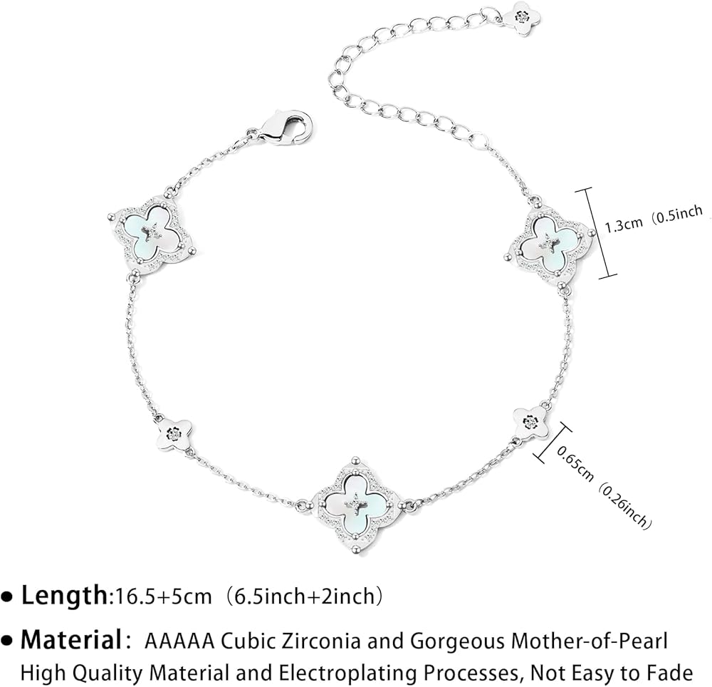 【سوار البرسيم الرقيق】قلادة رقيقة من أربع أوراق مع أحجار الزركونيا المكعبة اللامعة، ترمز إلى الحظ والحب. زركونيا مكعبة مقطوعة بدقة توفر تألقًا لا يتأثر بمرور الزمن.