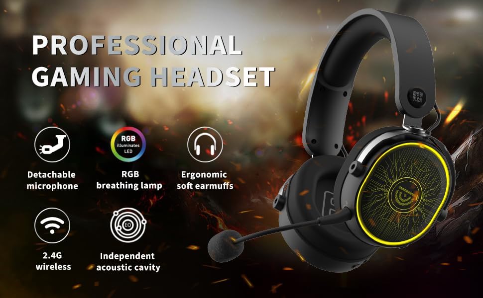 سماعة ألعاب لاسلكية TRUSYO AUDIO 2.4 جيجا هرتز للكمبيوتر وبلاي ستيشن ونينتندو سويتش والكمبيوتر الشخصي، مع أضواء RGB منخفضة التأخر وعمر بطارية طويل للاعبين (أسود)