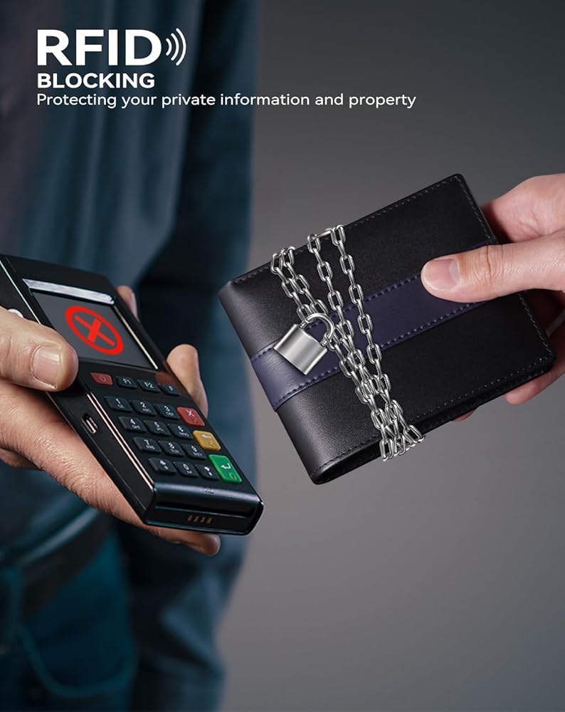 【حماية حجب RFID】تتميز محفظة RFID هذه بتقنية RFID الآمنة المتقدمة وهي مصنوعة من مركب معدني فريد مصمم لمنع إشارات RFID 13.56 ميجا هرتز أو أعلى. يوفر حماية معززة لبطاقة الخصم وبطاقة الائتمان والبطاقات المهمة الأخرى مع شرائح RFID، مما يحميها من عمليات المسح غير المصرح بها ويضمن راحة البال.