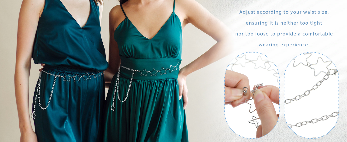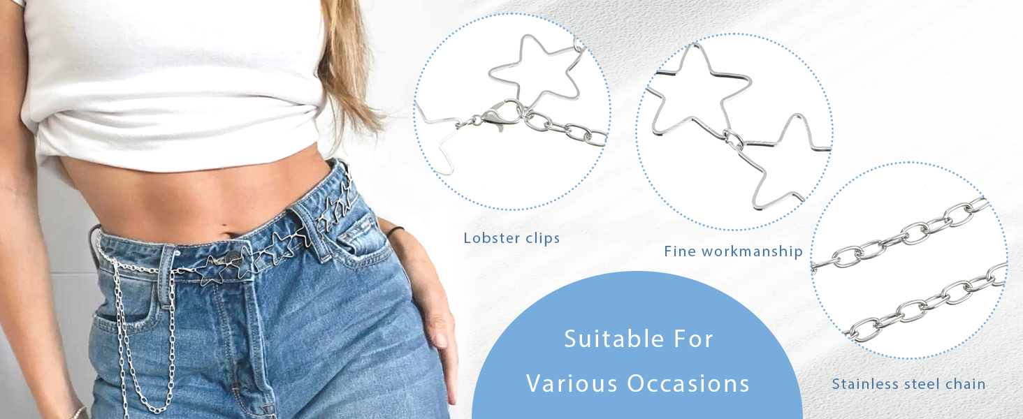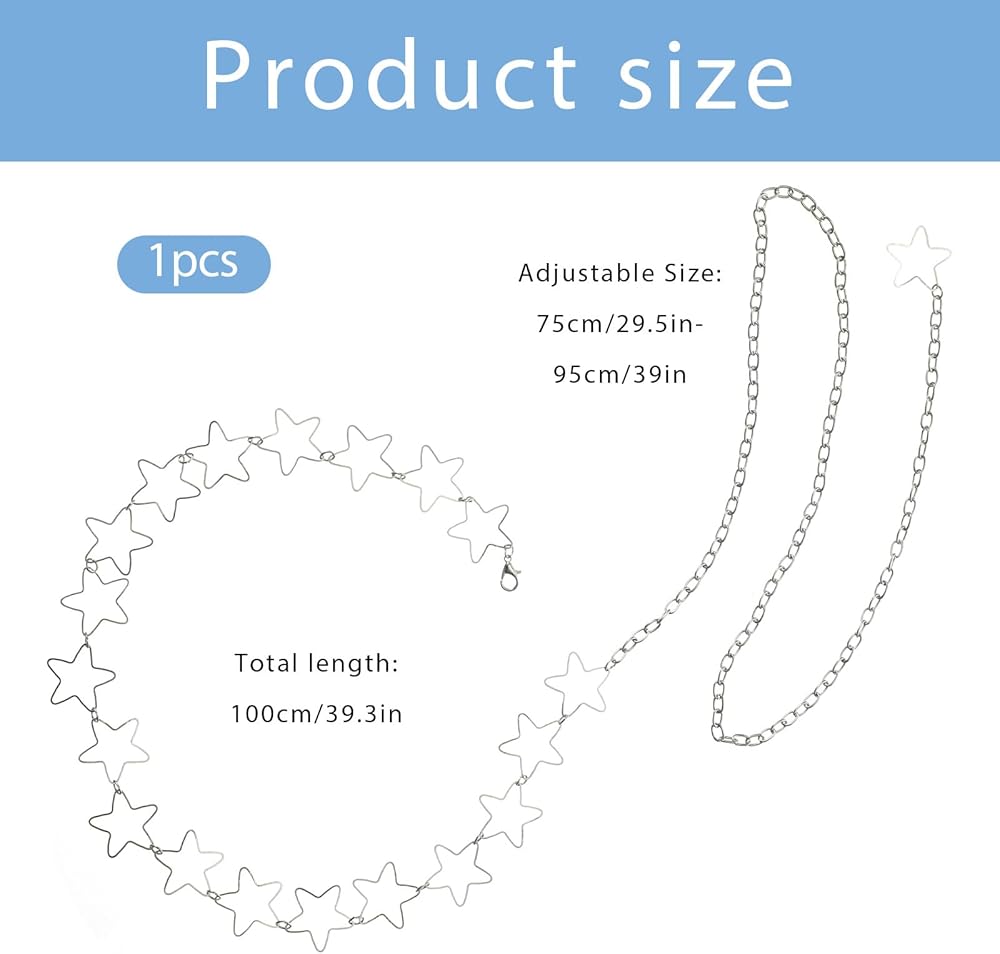 ملاءمة مريحة قابلة للتعديل - توفر سلسلة الخصر النجمية هذه طولًا قابلاً للتعديل يبلغ حوالي 75-100 سم (29.5-39.5 بوصة)، مما يوفر ملاءمة قابلة للتخصيص تناسب خصرك بشكل مثالي؛