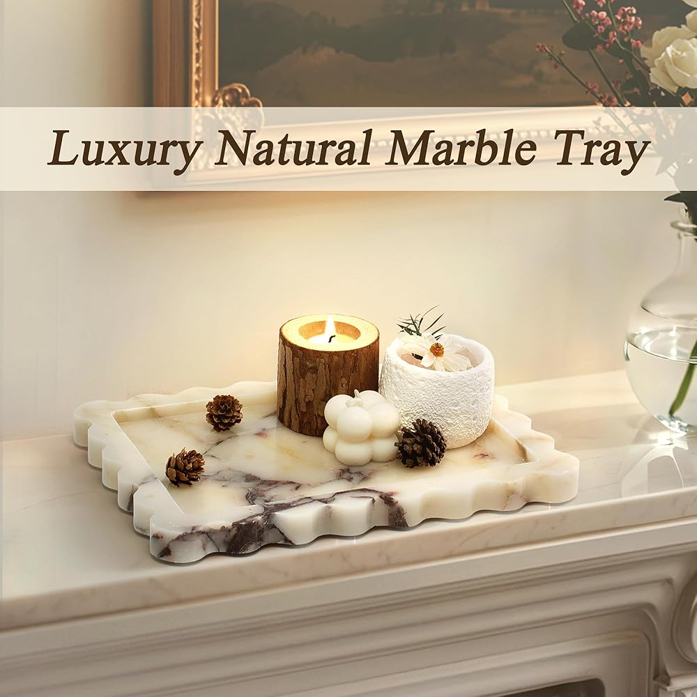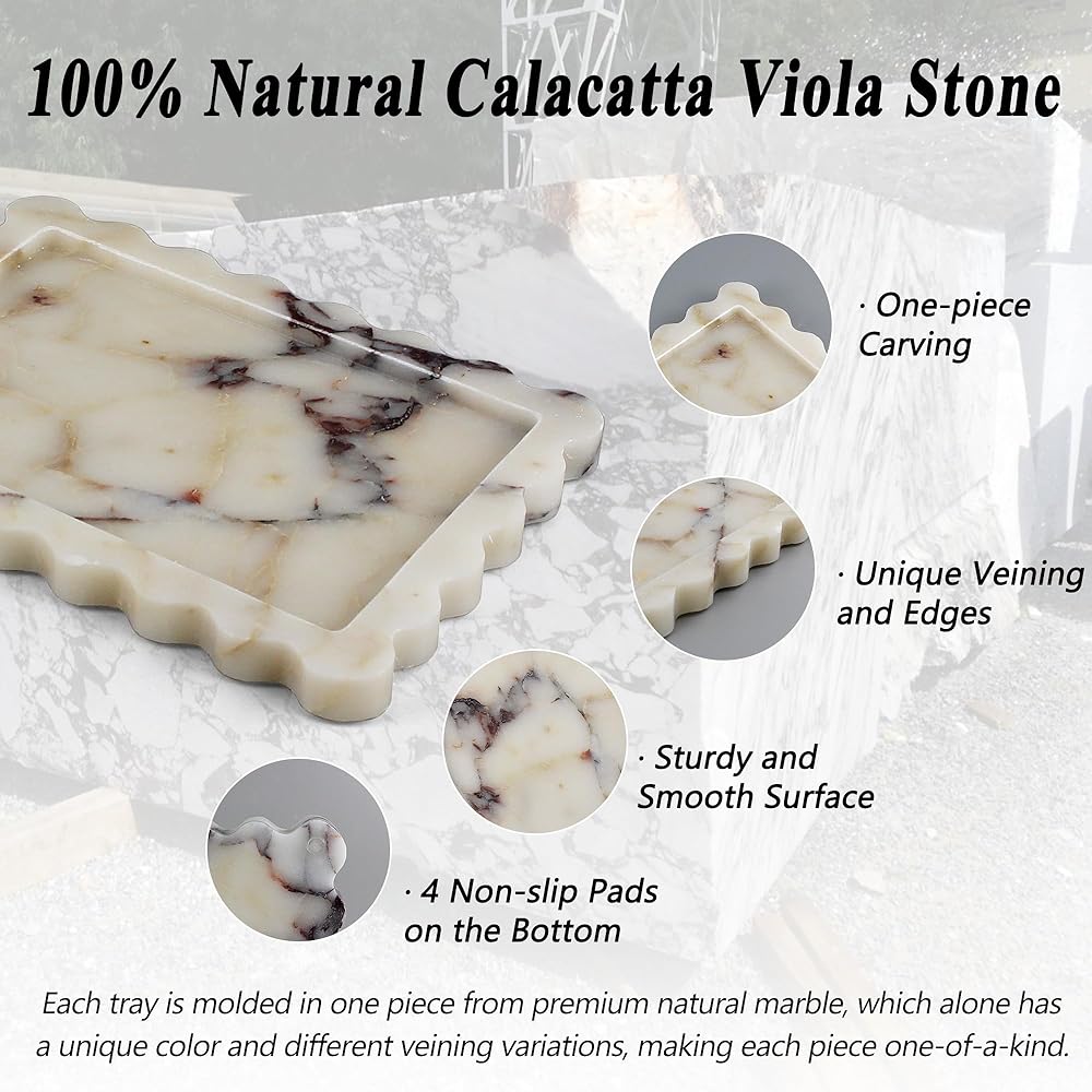 [رخام أصلي فاخر]: أضف لمسة من الرقي مع صينية الرخام المصقولة يدويًا، والتي تتميز بحواف صدفية أنيقة وعروق طبيعية. مصنوعة من رخام كالاكاتا فيولا الحقيقي بنسبة 100%، كل صينية مصنوعة بشكل فريد - لا يوجد اثنتان متماثلتان على الإطلاق. قطعة خالدة من الخزف الحجري الفاخر، وليست من الراتنج أو السيراميك.
