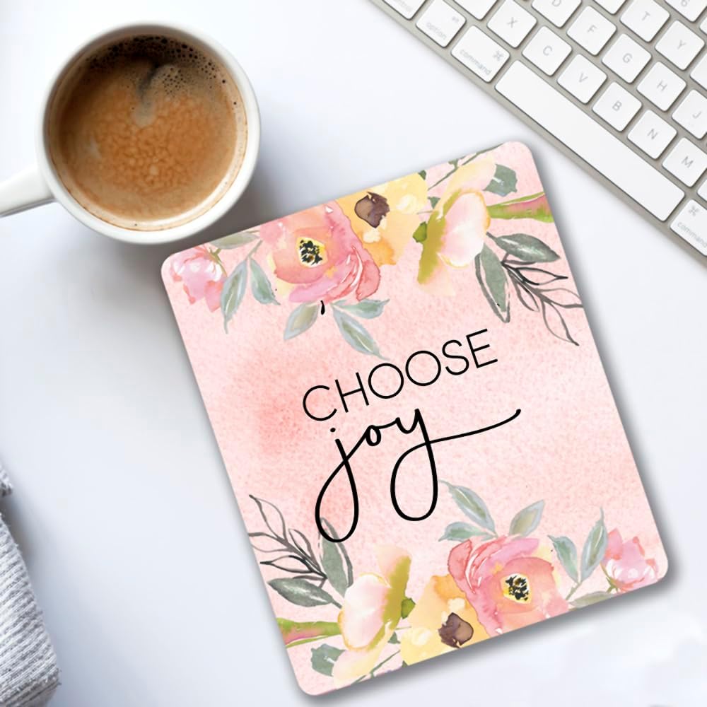 تُعد لوحة الماوس الجميلة ذات الأزهار إكسسوارًا جميلاً لتزيين مكتبك أو مقصورتك. يحتوي رذاذ الأزهار على ظلال باستيل من اللون الوردي والأصفر والرمادي. الاقتباس باللون الأسود ومكتوب عليه "Choose Joy".
