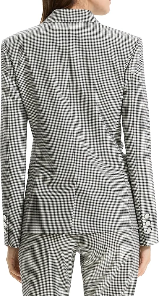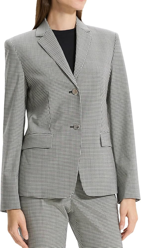 - A clean single breasted two button blazer with front pockets and metal button closure.
