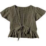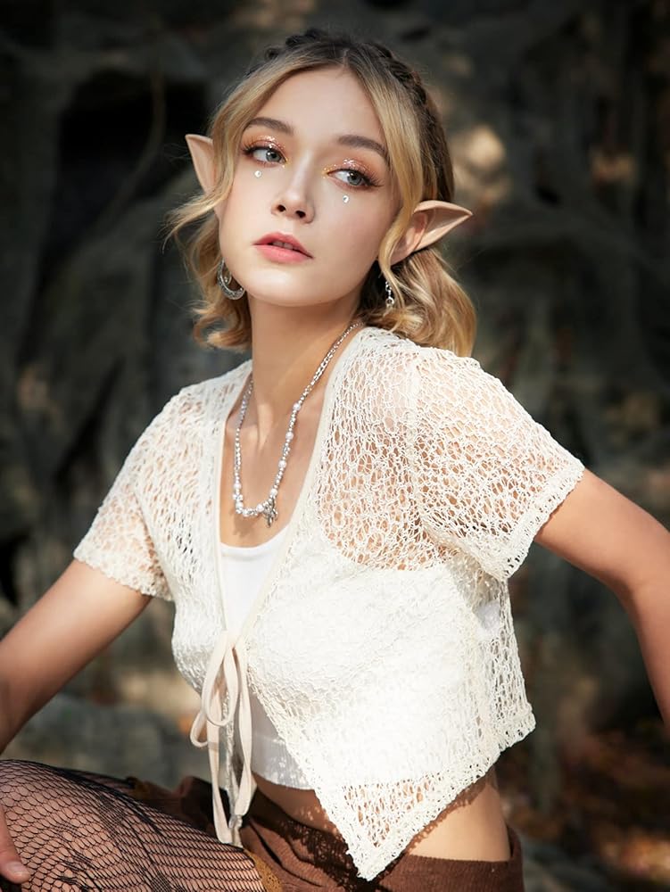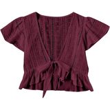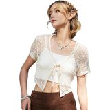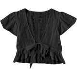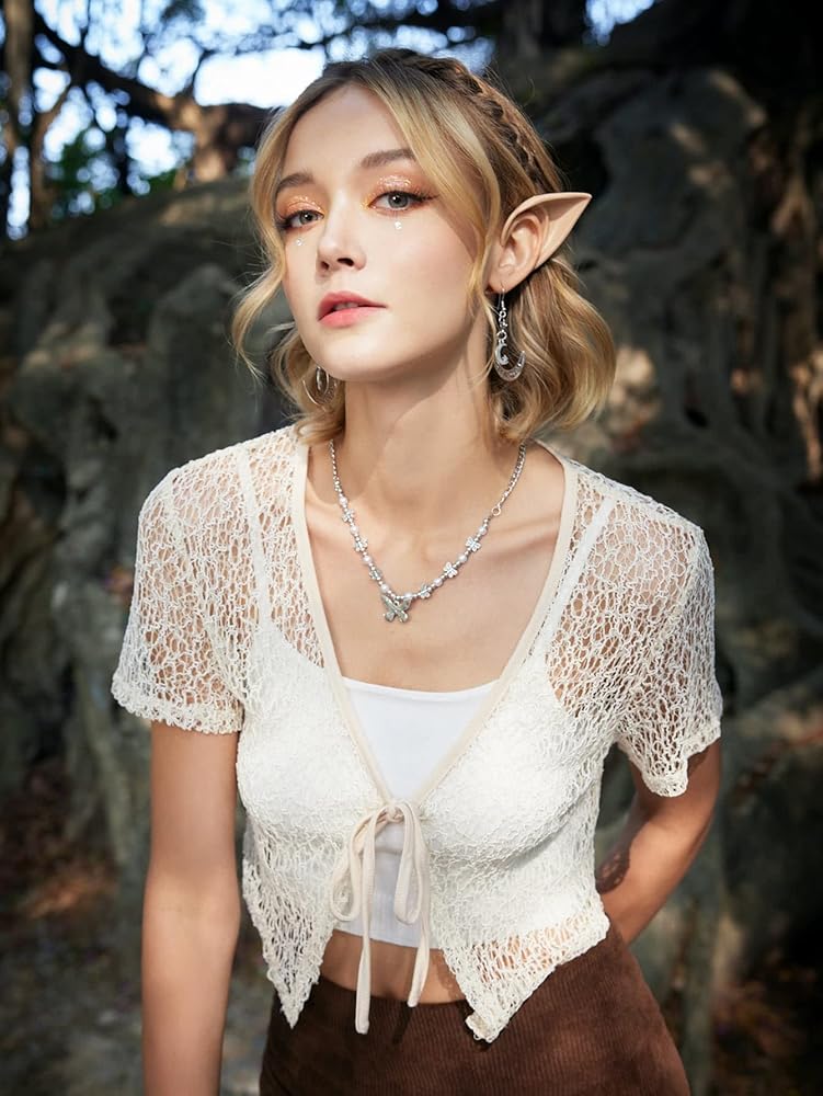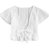 - رقبة على شكل حرف V، أكمام على شكل فراشة، كشكش، عقدة، دانتيل متباين، لون عادي.