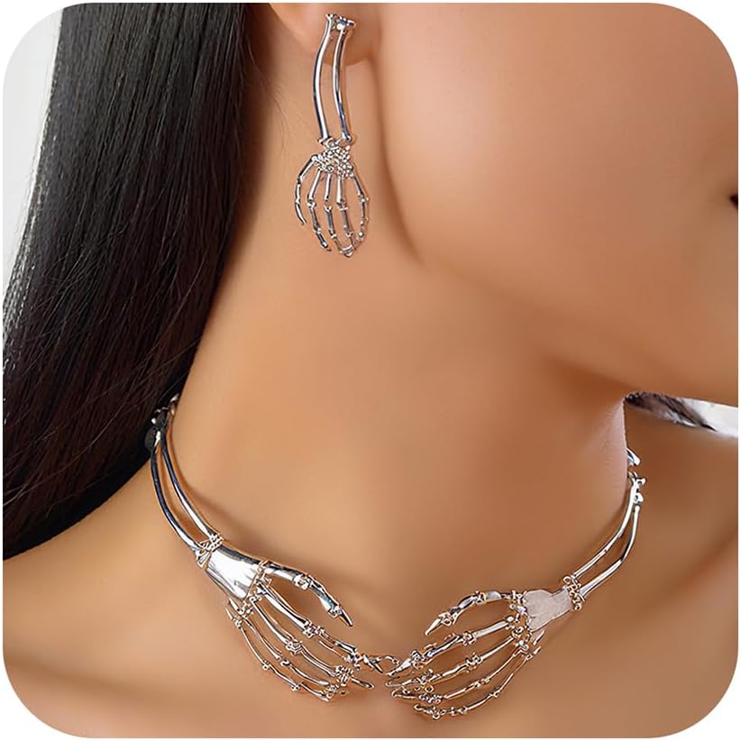 Halloween Necklace for Women: Crafted for women, this necklace features skeletal hand elements. Coordinates with Halloween costumes or gothic outfits