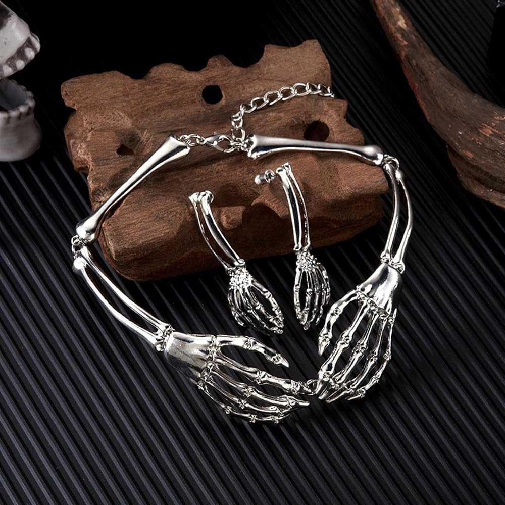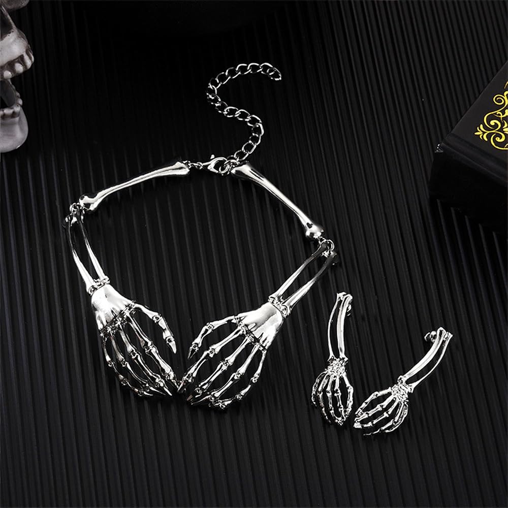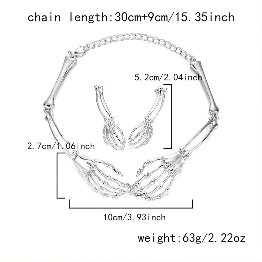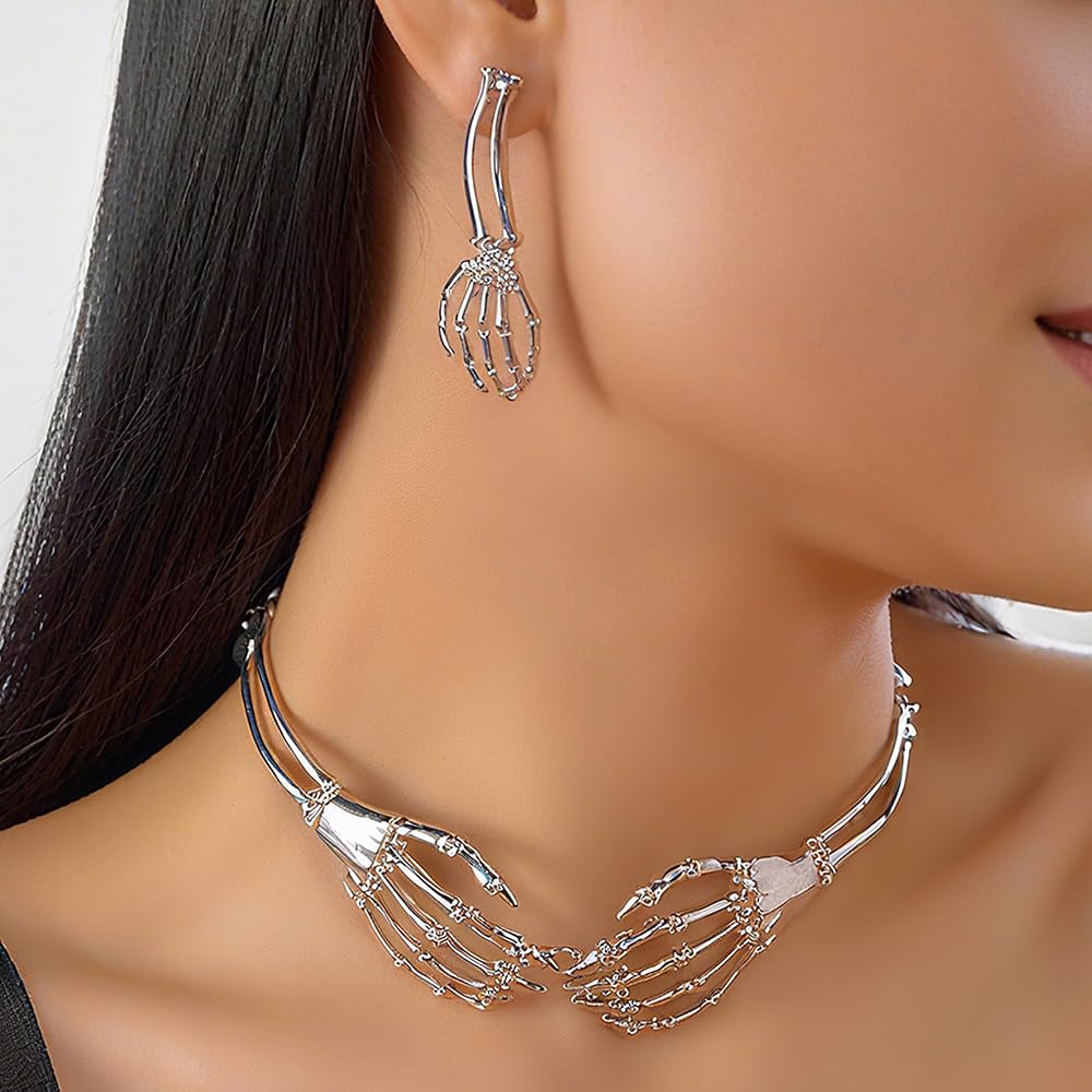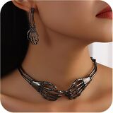 This Gothic Skeleton Necklace Earrings Set offers distinctive style for Halloween and gothic jewelry enthusiasts. Featuring skeleton hand designs on the choker and earrings in silver or black finishes, it adds thematic accents to various looks. Suitable for coordinating with Halloween costumes, gothic outfits, or as a gift option for skeleton and gothic accessory collections